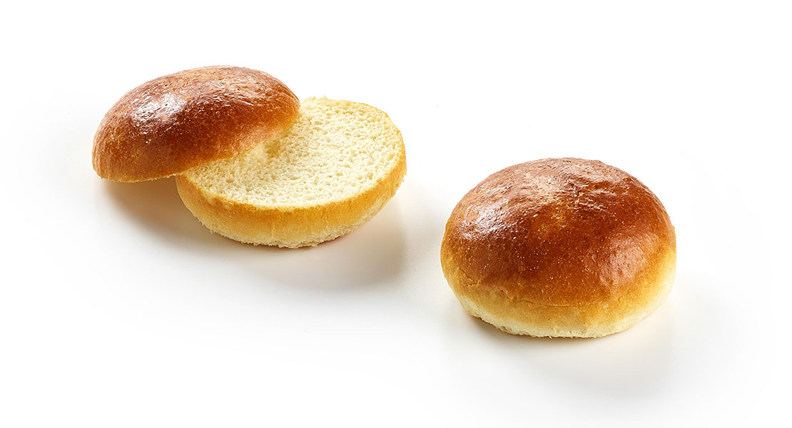 Weiches, rundes, mittelgroßes Brötchen aus Briocheteig, vorgeschnitten.
