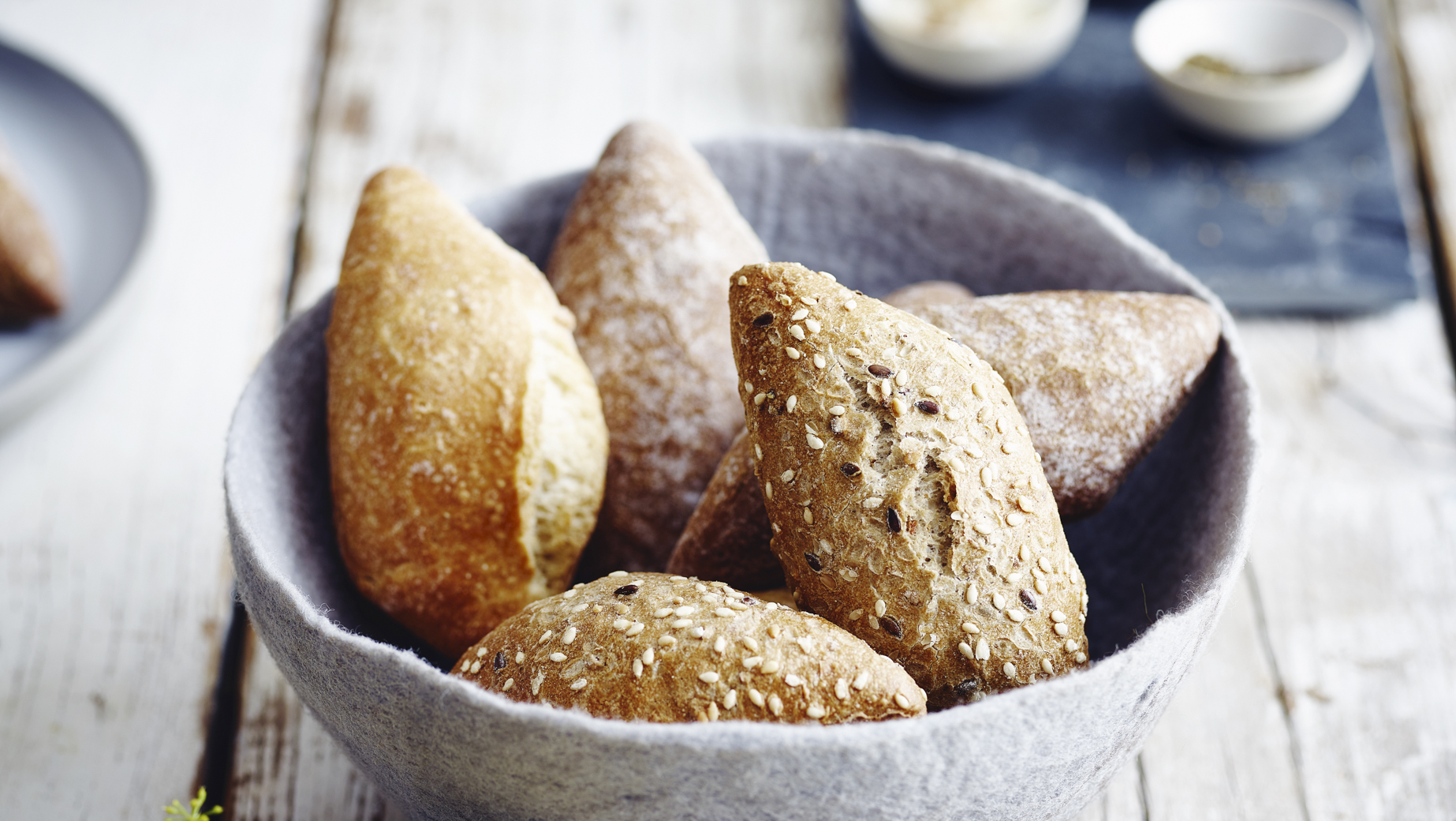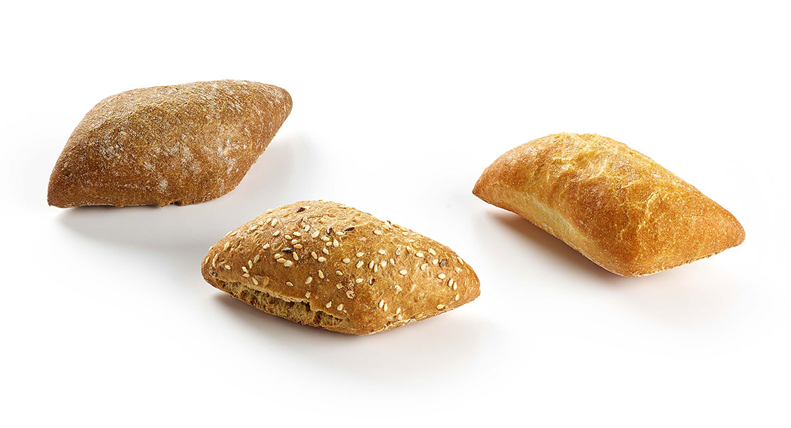 Sortiment von rustikalen, auf Stein gebackenen Mini-Rautenbrötchen: 45 mehlbestäubte Weizenbrötchen, 45 Mehrkornbrötchen, garniert mit Samen und 45 mehlbestäubte dunkle Brötchen mit Kümmelaroma.