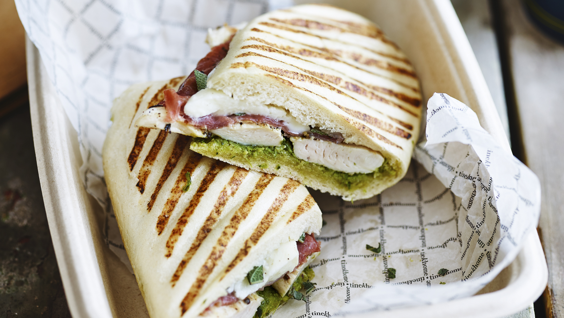 - Für ein schönes rechteckiges Krustenmuster das Panini kreuzweise zu den vorgebackenen Streifen grillen.