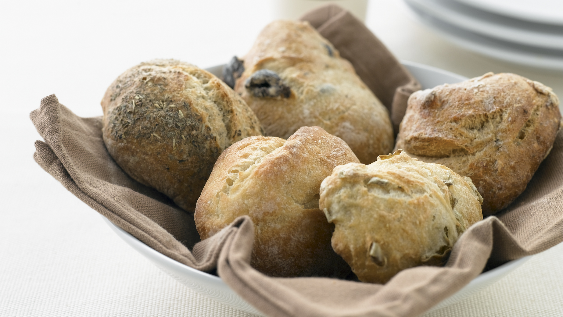 Rustikales Mini-Brötchen-Sortiment mit 5 unterschiedlichen, kleinen, handgeformten Brötchen-Spezialitäten: Olive, Chili, Tomate & Basilikum, italienische Kräuter, Natur.