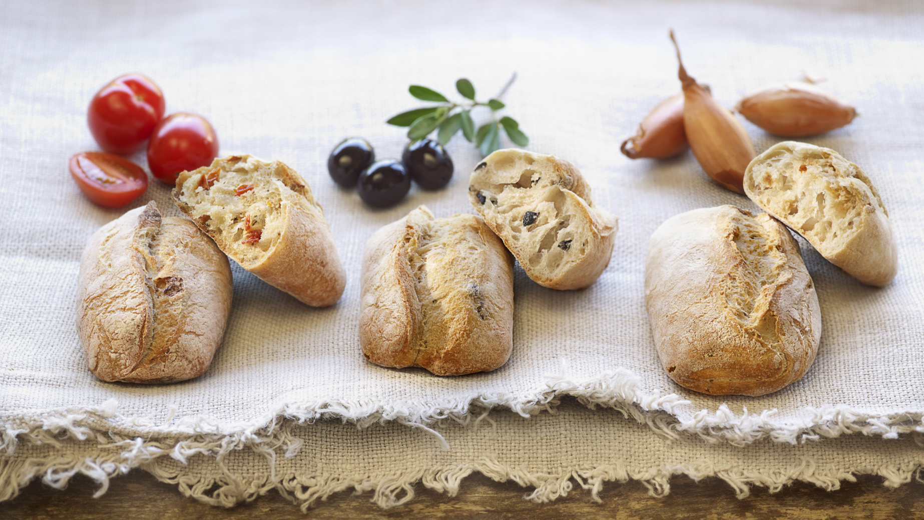 Gemischte Box handwerklicher Mini-Weizenbrötchen, auf Stein gebacken, in 3 Geschmacksrichtungen: 12 Tomatenbrötchen, 12 Zwiebelbrötchen und 12 Brötchen mit schwarzen Oliven. Als Beilage zu Suppen & Salaten.