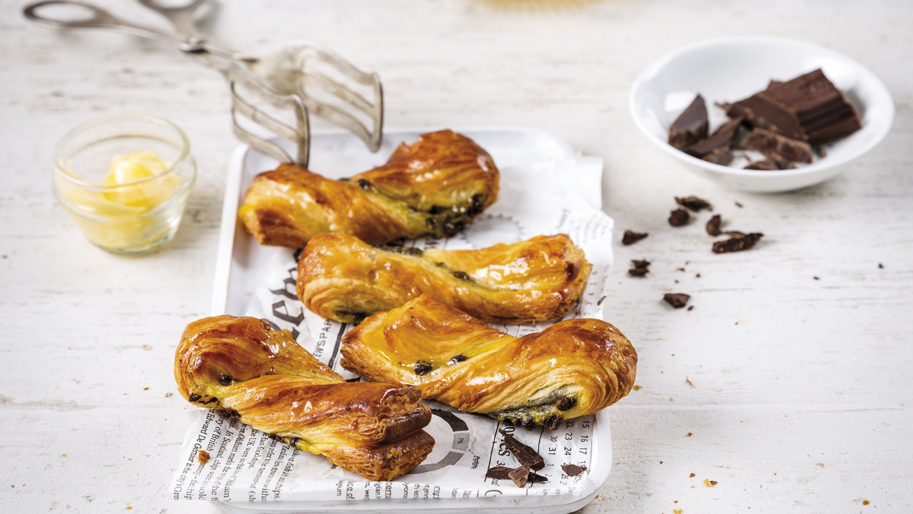 Gedrehter, geschichteter Hefeteig (mit feiner Butter) mit Vanillecreme und viel Zartbitterschokoladenperlen. Hergestellt mit 12% Butter (Anteil am Gesamtrezept).