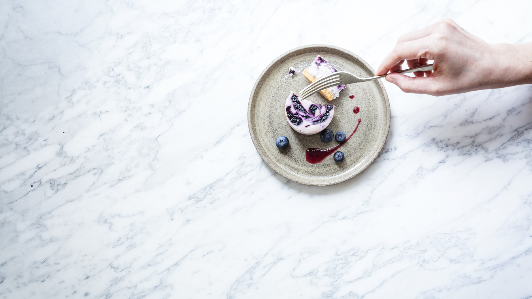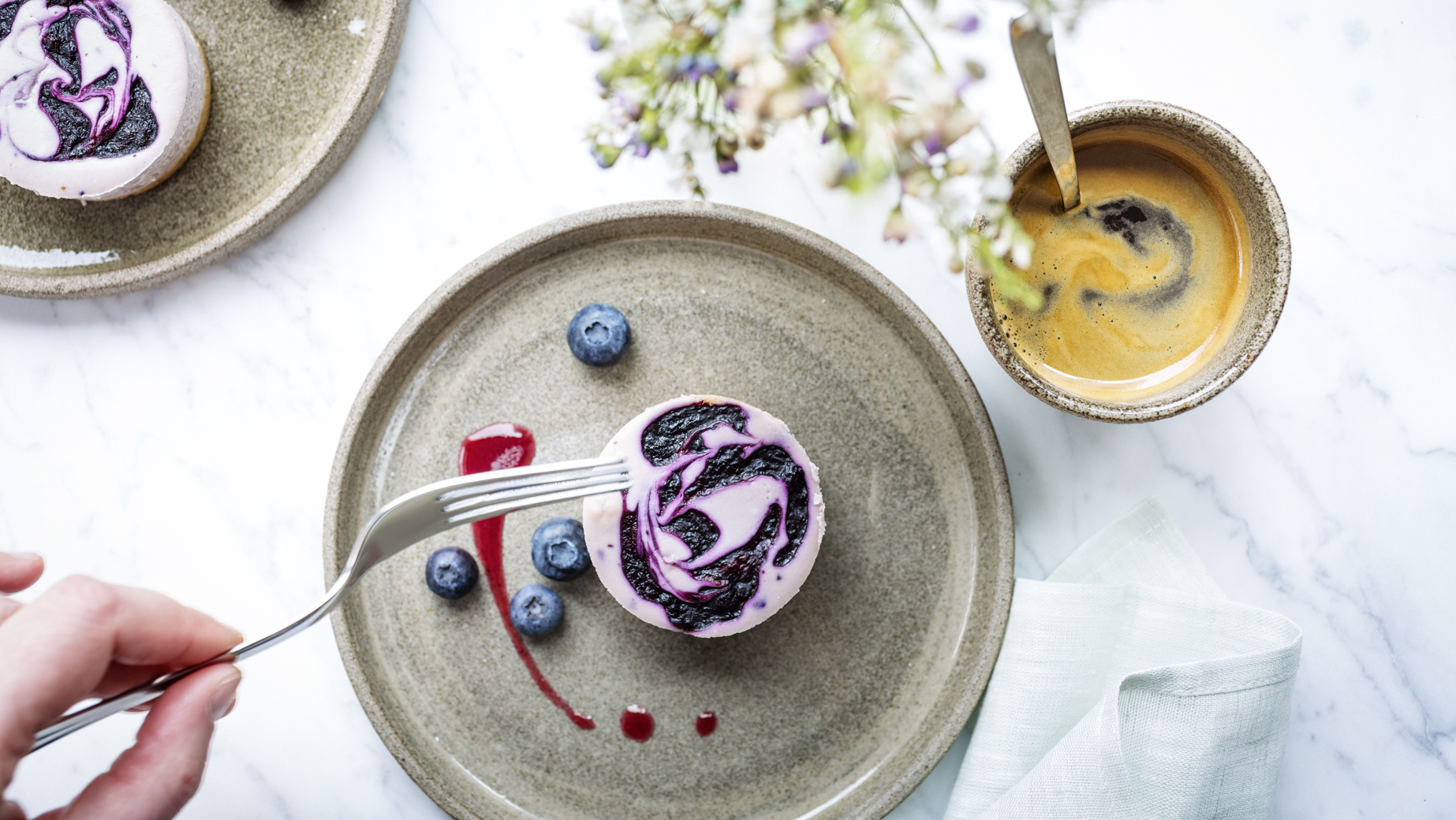 Käsesahnekuchen in Portionsgröße mit Heidelbeeren auf einem Mürbeteigkeks.