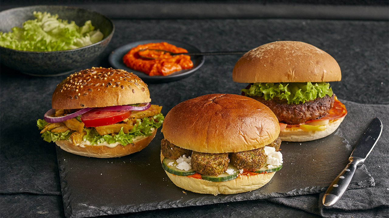 Diese erstklassigen weichen Brötchen wurden speziell für den trendigen Hamburger-Markt entwickelt. Dank der Anreicherung behalten sie ihre Weichheit länger, und das mit einer festen und elastischen Krume. Dank des Rezepts toastet (karamellisiert) die Krume auch schneller und gleichmäßig über die gesamte Schnittfläche. Dies ist wichtig, um eine gewisse Knusprigkeit zu schaffen, aber sicher auch, um einen Schutzfilm zu schaffen, der verhindert, dass die Krume feucht wird. Produkt zum Auftauen & Servieren, vorgeschnitten und im Kissen verpackt.