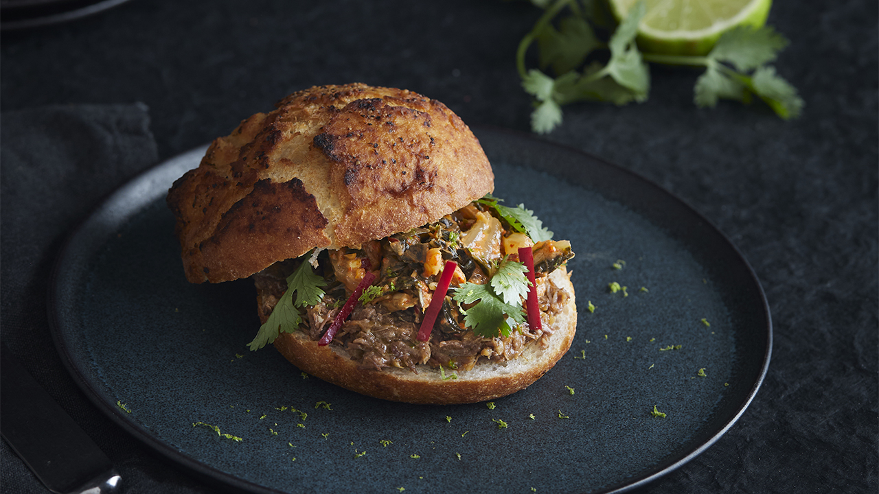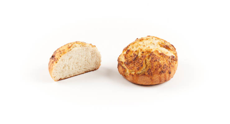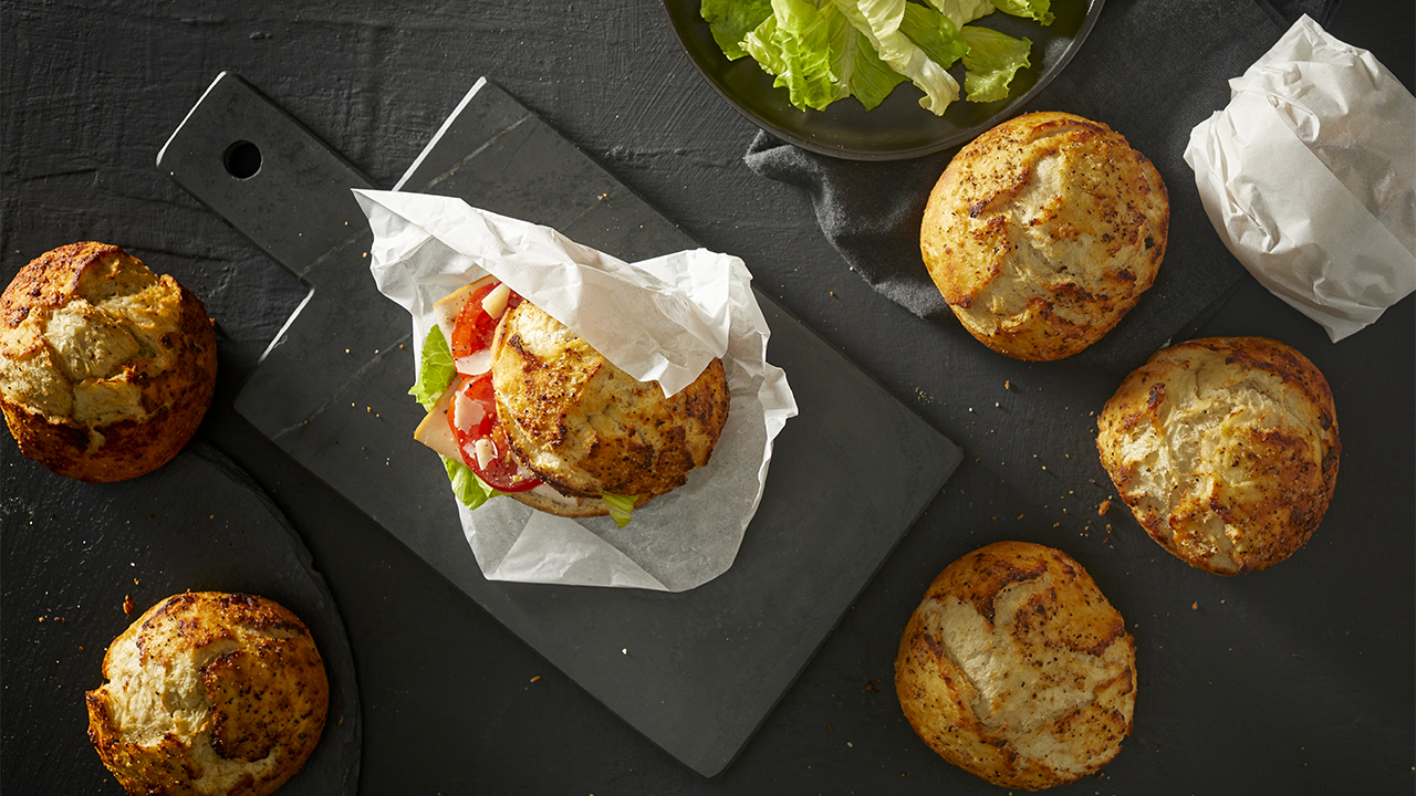 Weizenbrötchen mit einer ausdrucksvollen, berstenden Kruste und einer saftigen, luftigen Krume. Mit einer Paste aus Pflanzenöl mit Meersalz und schwarzem Pfeffer bedeckt, mit Kartoffelflocken und Joghurt als geheimer Zutat für eine anhaltende sensorische Frische veredelt.
