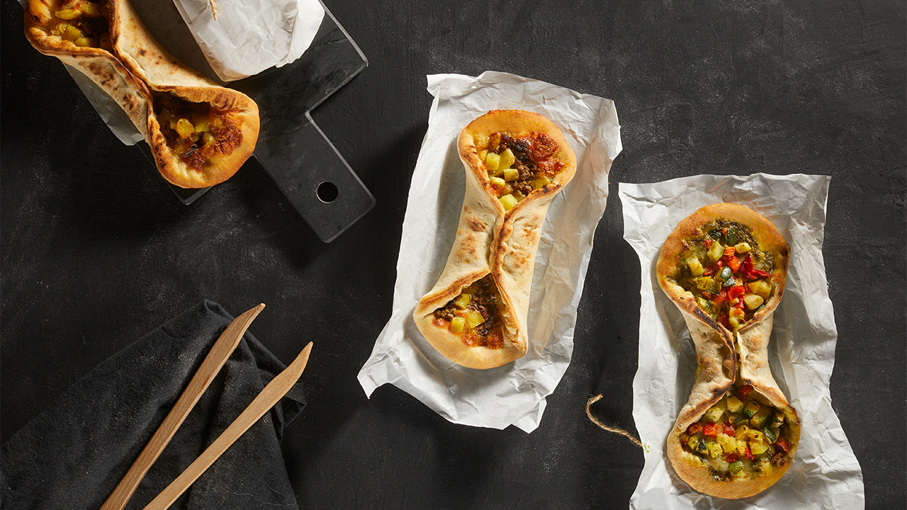 Mit der Hand gefaltete bogenförmige Pizza, gefüllt mit Mozzarella, Kartoffelscheiben, Steinpilzen (Porcini), Petersilie und Rosmarin, auf Stein gebacken.