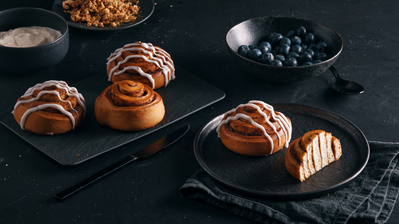 Authentische dänische weiche Zimtschnecke aus Brioche-ähnlichem Hefeteig, gefüllt mit der berühmten Lord Mayor-Füllung (weißer und brauner Zucker mit Zimt). 1 Spritzbeutel mit weißer Glasur für die Dekoration liegt bei.