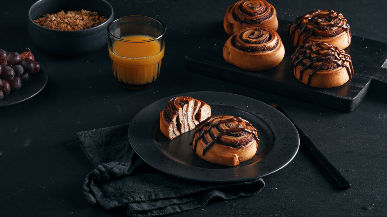 Authentische dänische weiche Zimtschnecke aus Brioche-ähnlichem Hefeteig, gefüllt mit der berühmten Lord Mayor-Füllung (weißer und brauner Zucker mit Zimt) und dunkle Schokolade. 1 Spritzbeutel mit brauner Glasur für die Dekoration liegt bei.