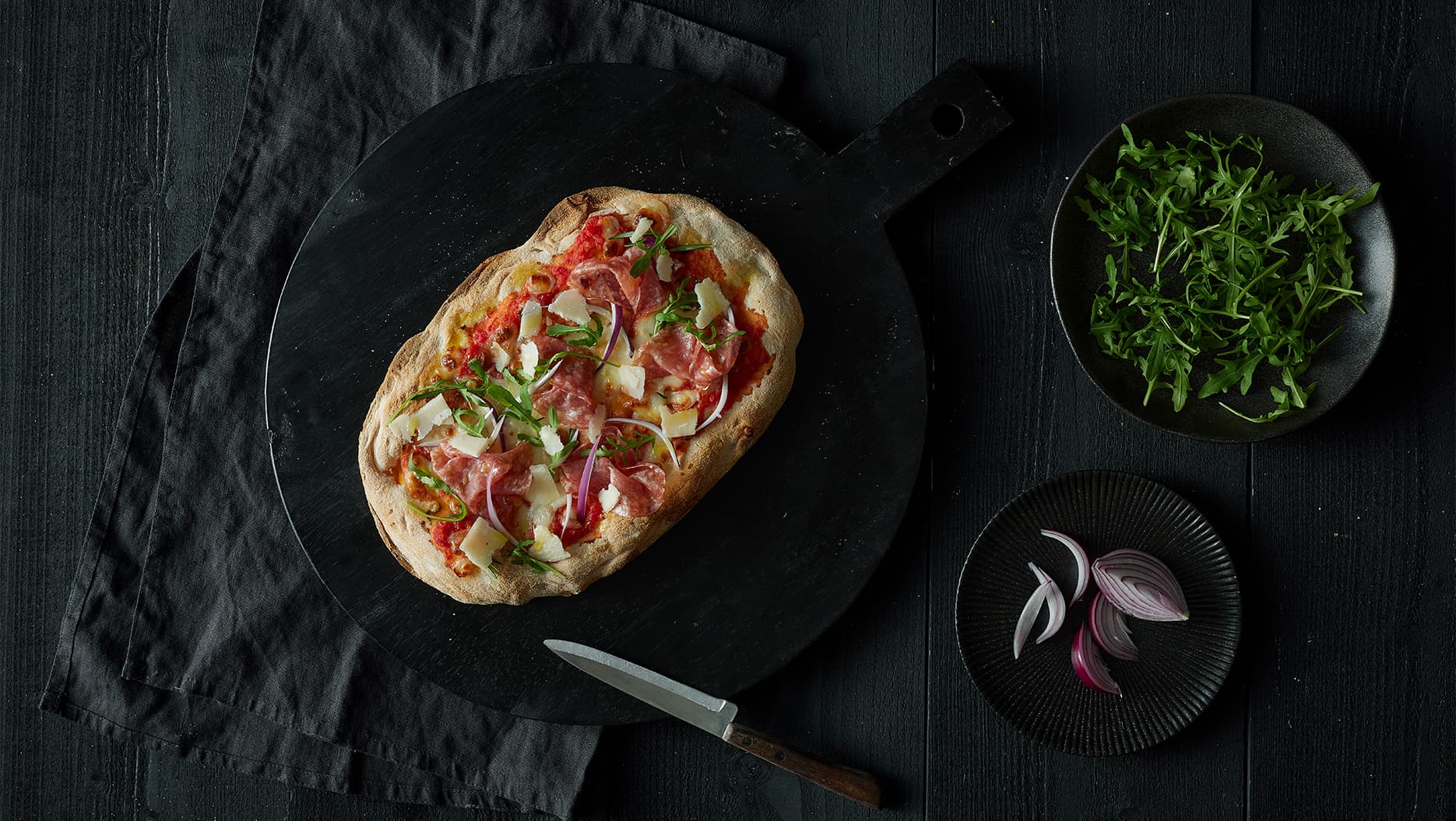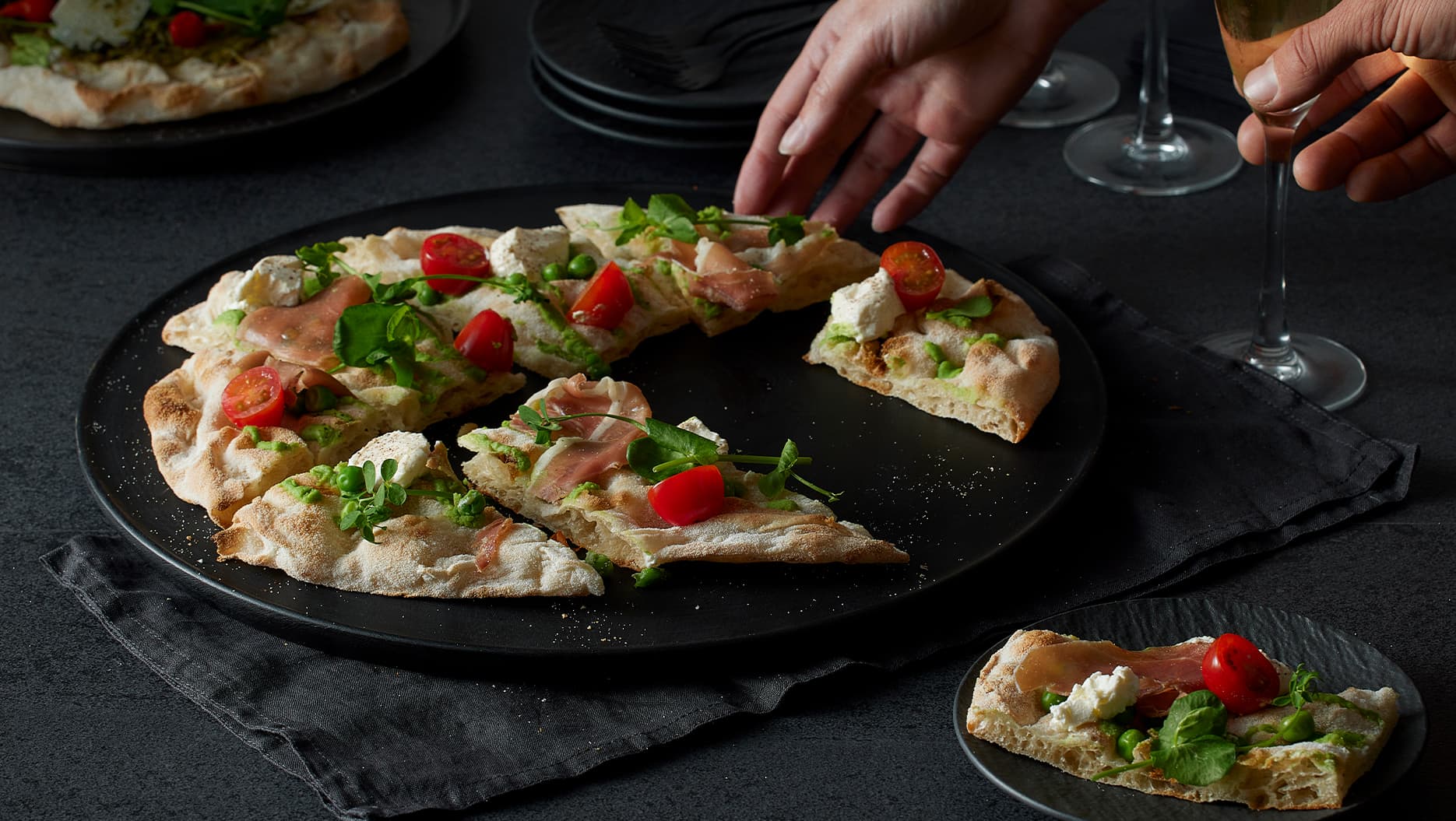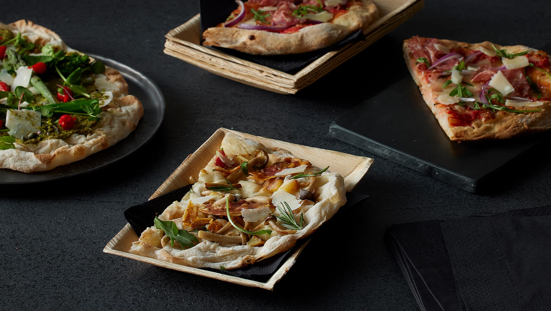 Authentischer italienischer, leichter Pizzaboden aus hochhydratisiertem Teig, hergestellt aus einer Mischung von Weizen-, Reis- und Sojamehl und einem Sauerteigstarter, angereichert mit nativem Olivenöl. Das lange und sanfte Knetverfahren, gemeinsam mit einer Reifezeit von bis zu 48 Stunden ergibt einen dünnen, knusprigen und saftigen Pizzaboden. Mit der Hand ausgezogen.
