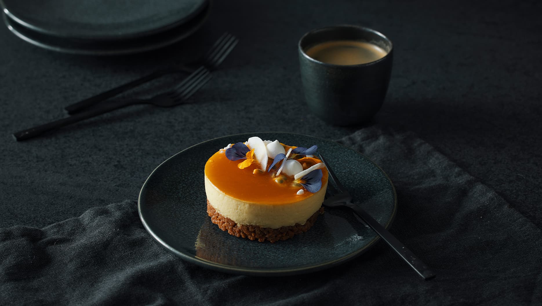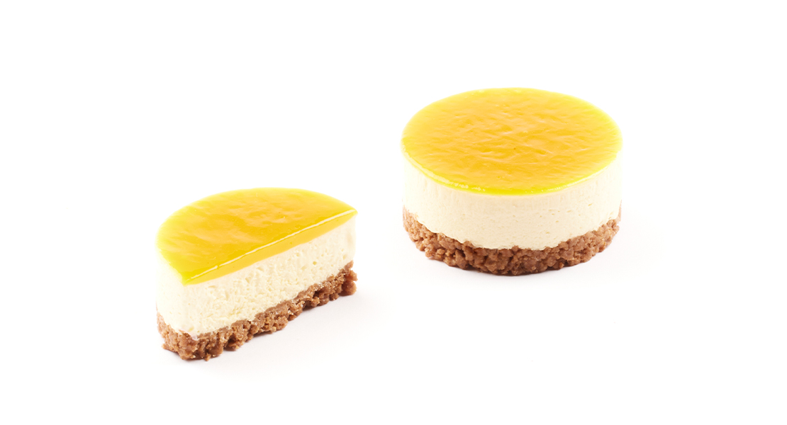 Pflanzliches Maracuja- und Mangomousse aus echtem Fruchtpüree auf einem Spekulatius-Crumble, vollendet mit glänzender Mangoglasur.