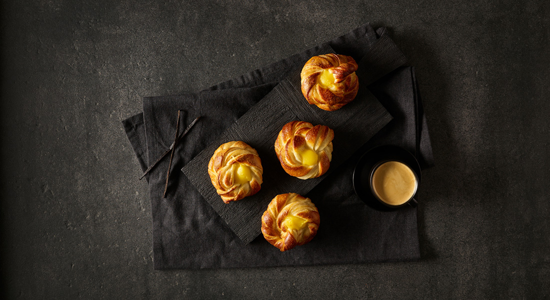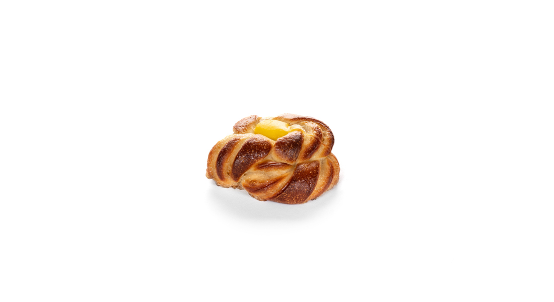 Svensk inspireret snurre med blød gærdej. Manuelt foldet i en traditionel snurre-form. Fyldt med creme, drysset med sukkerperler.