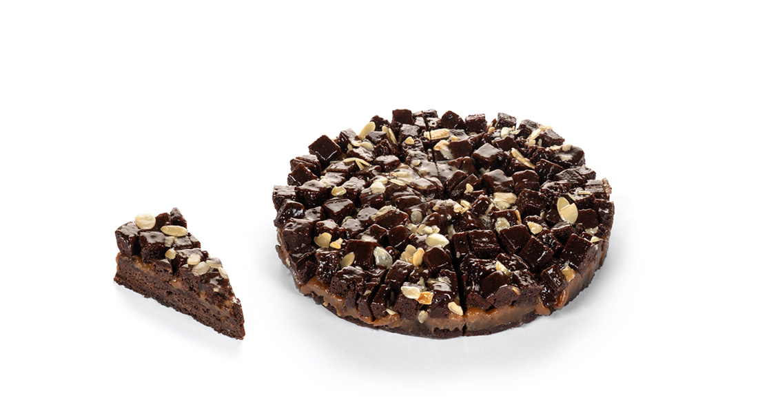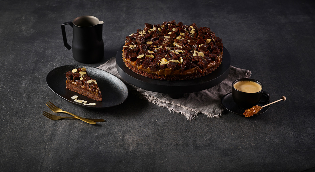 Portionsskåret brownietærte (12 styk.) med salt-karamel fyld. Toppet med mandelflager.