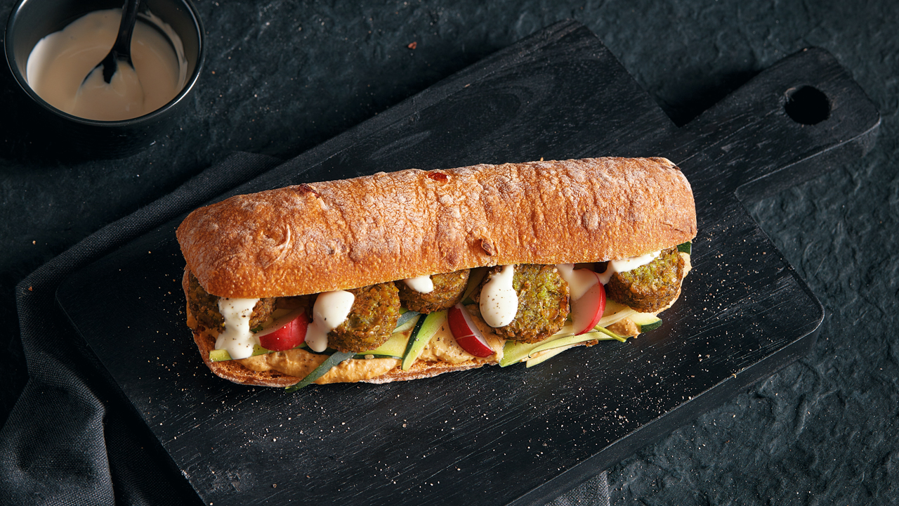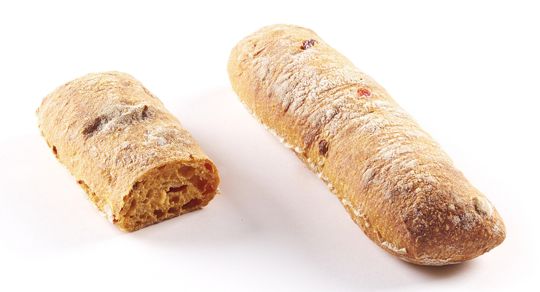 Media baguette artesana de harina de trigo y masa madre de centeno líquida, enriquecida con pimiento, tomate seco, chile y un toque de tabasco. Los tiempos prolongados de reposo y maduración (2 x 12 h) aportan aún más sabor a la miga húmeda y semiabierta. Práctica, de forma rectangular.