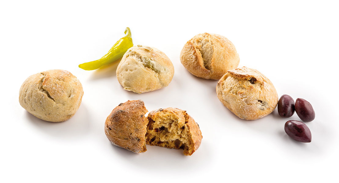Surtido de pequeños panecillos exquisitos hechos a mano con harina de trigo en 5 sabores distintos: olivas, chile, tomate y albahaca, hierbas del Mediterráneo, normal.