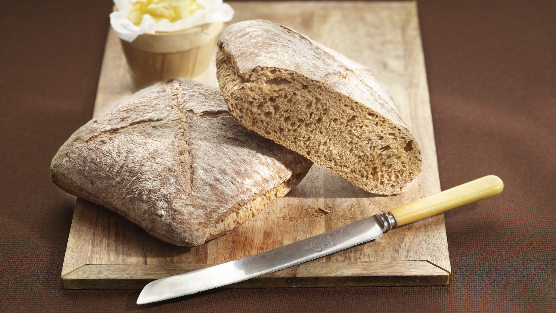Pan de payés tradicional orgánico, horneado a la piedra y con una incisión en forma de cruz en la parte superior. Enriquecido con un toque de malta tostada y espolvoreado con harina.