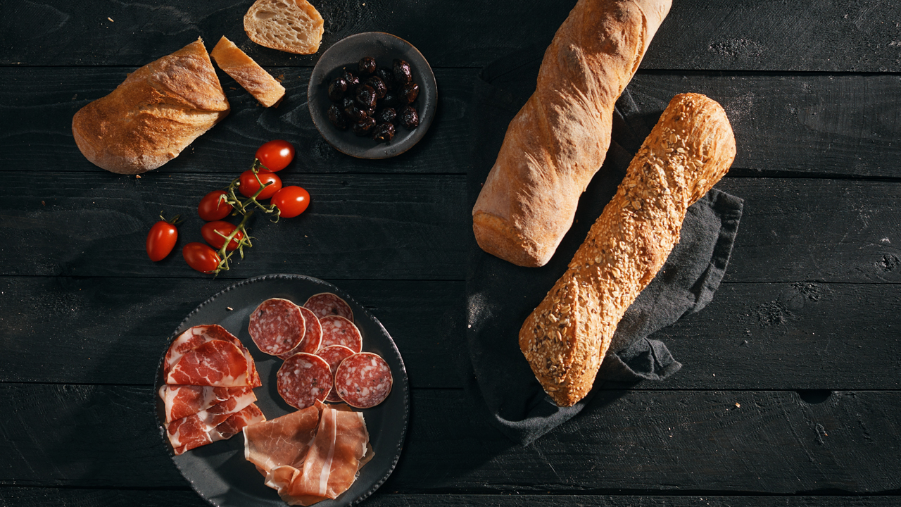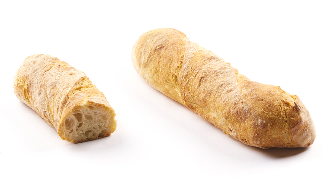 Impresionante baguette ancha artesana de harina de trigo y centeno con masa madre de centeno. Los tiempos prolongados de reposo y maduración (2 x 12 h) aportan aún más sabor a la miga húmeda y semiabierta. Un producto artesano real con un sabor auténtico, retorcido a mano y horneado a la piedra.
