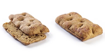 Pan plano tradicional italiano. Focaccia hecha con una mezcla de harina de trigo integral, harina de centeno y espelta, de miga abierta, con aceite de oliva virgen extra y una mezcla de mijo, linaza y pipas de girasol y horneada a la piedra. Ideal para bocadillos.