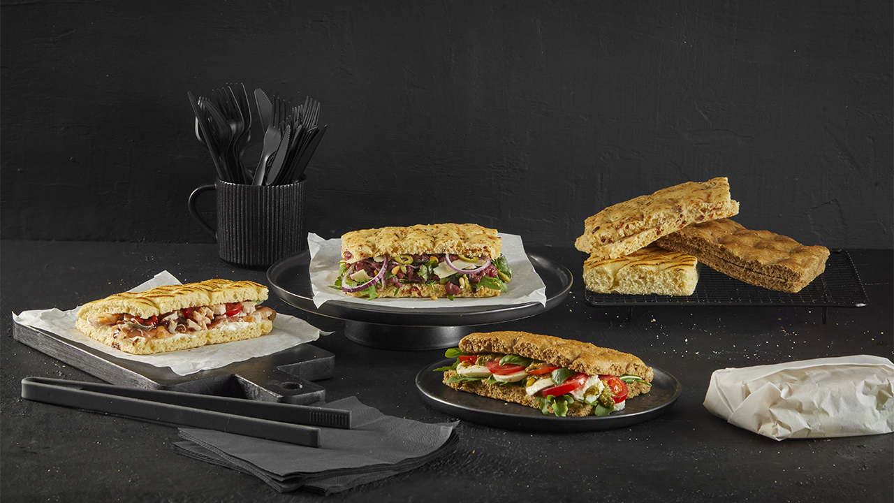 Focaccia rectangular prebraseada y precortada, elaborada con harina de trigo fina italiana (harina de tipo 0), enriquecida con aceite de oliva virgen extra. Ideal para bocadillos.