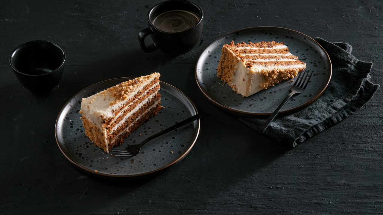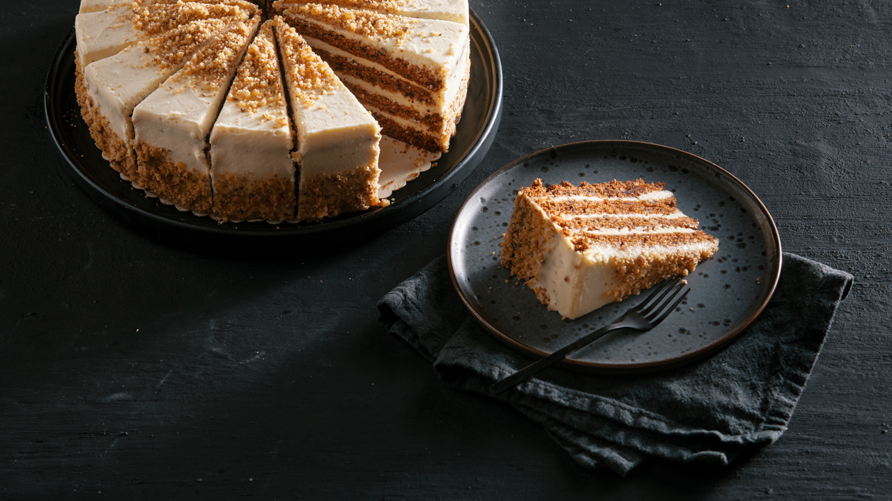 Pastel precortado (14 porciones) con cuatro capas de bizcocho de zanahoria, que se alternan con tres capas de queso crema suave. Cubierto con glaseado blanco y espolvoreado con nueces troceadas.