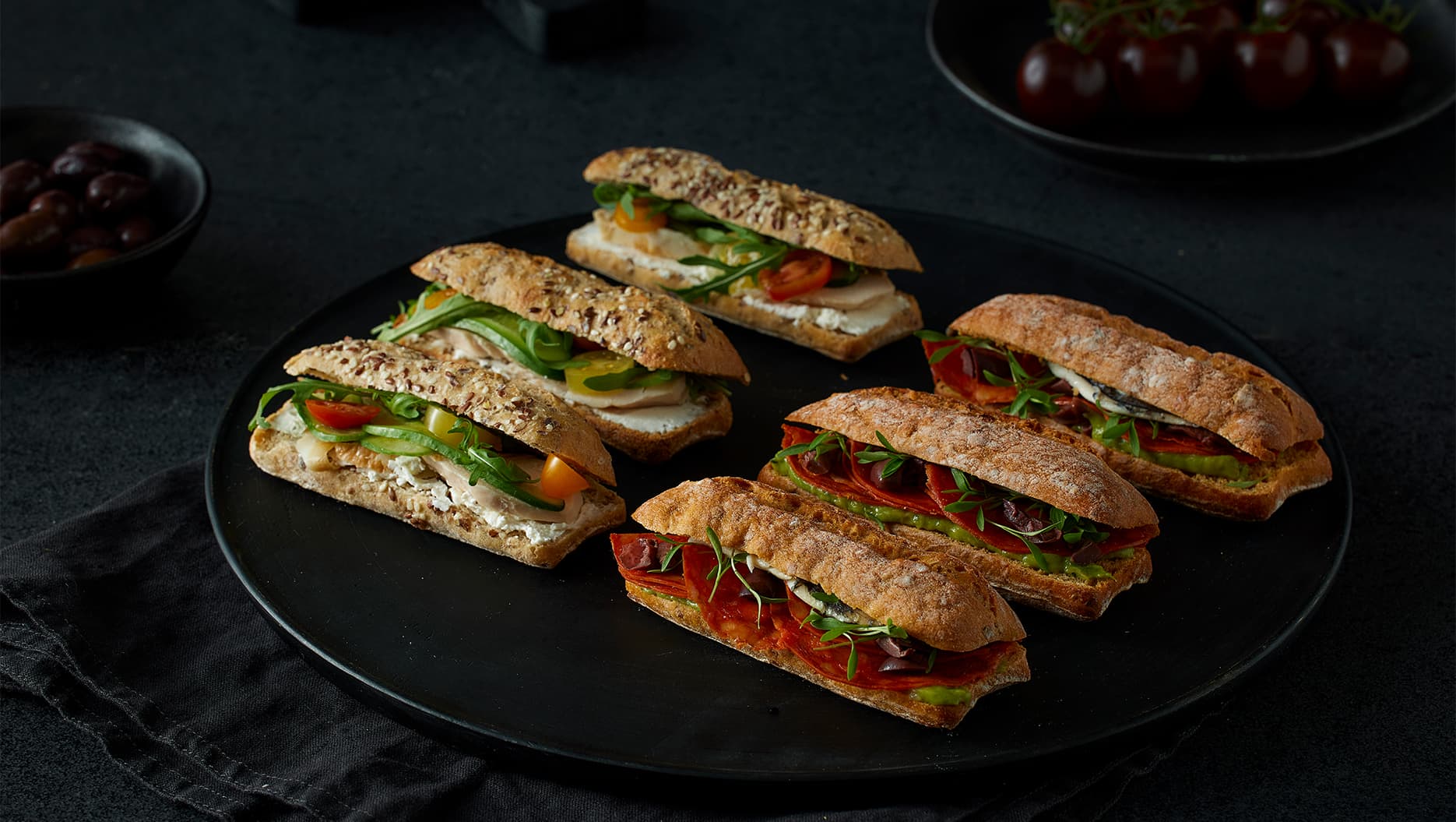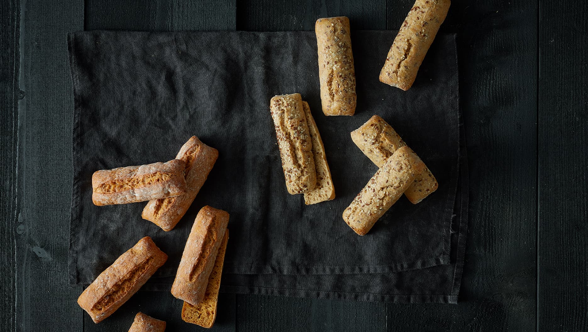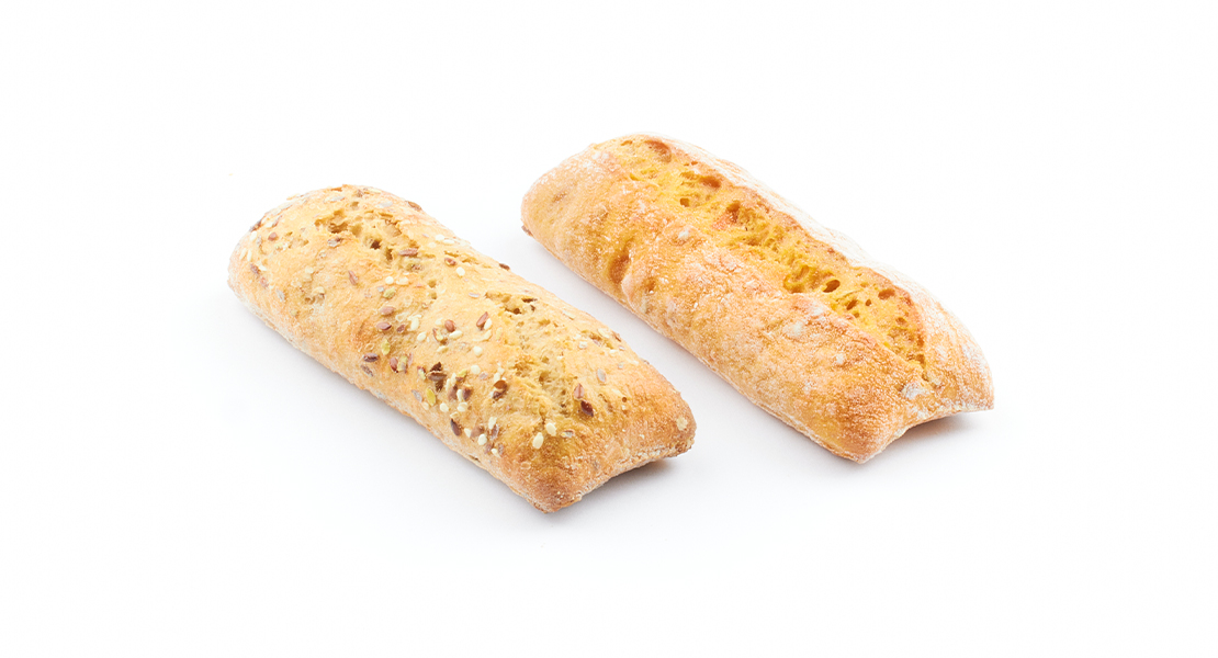 Surtido de panecillos rústicos elaborados con harina de trigo y de centeno y con masa madre de trigo líquida. 20 panecillos enriquecidos con cereales tostados (avena, espelta, linaza, semillas de sésamo, pipas de girasol, centeno molido) y 20 panecillos enriquecidos con tomates secos y romero. Estos sabores están reforzados por los largos tiempos de reposo.