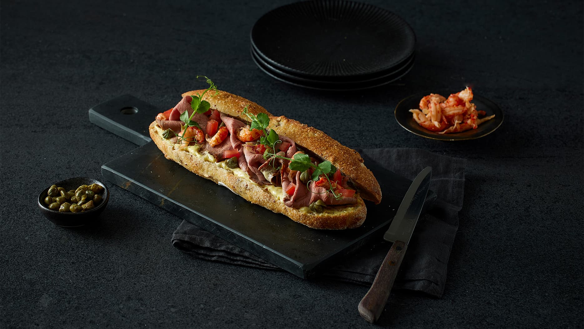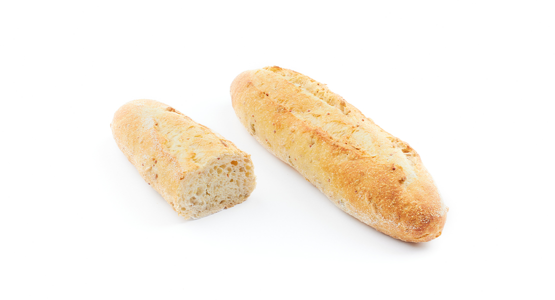 Media baguette ecológica artesana de harina de trigo y harina de trigo malteada. Elaborada con masa madre de trigo líquida activa y enriquecida con pipas de girasol, pipas de calabaza, sémola y cebada malteada. El lento proceso de amasado y el tiempo de maduración prolongado garantizan una miga muy abierta, una corteza muy fina y crujiente y un sabor puro y auténtico. Horneado a la piedra.