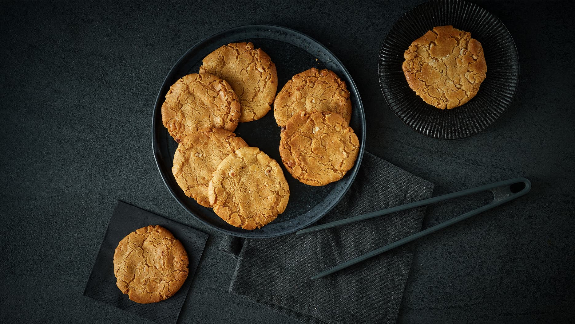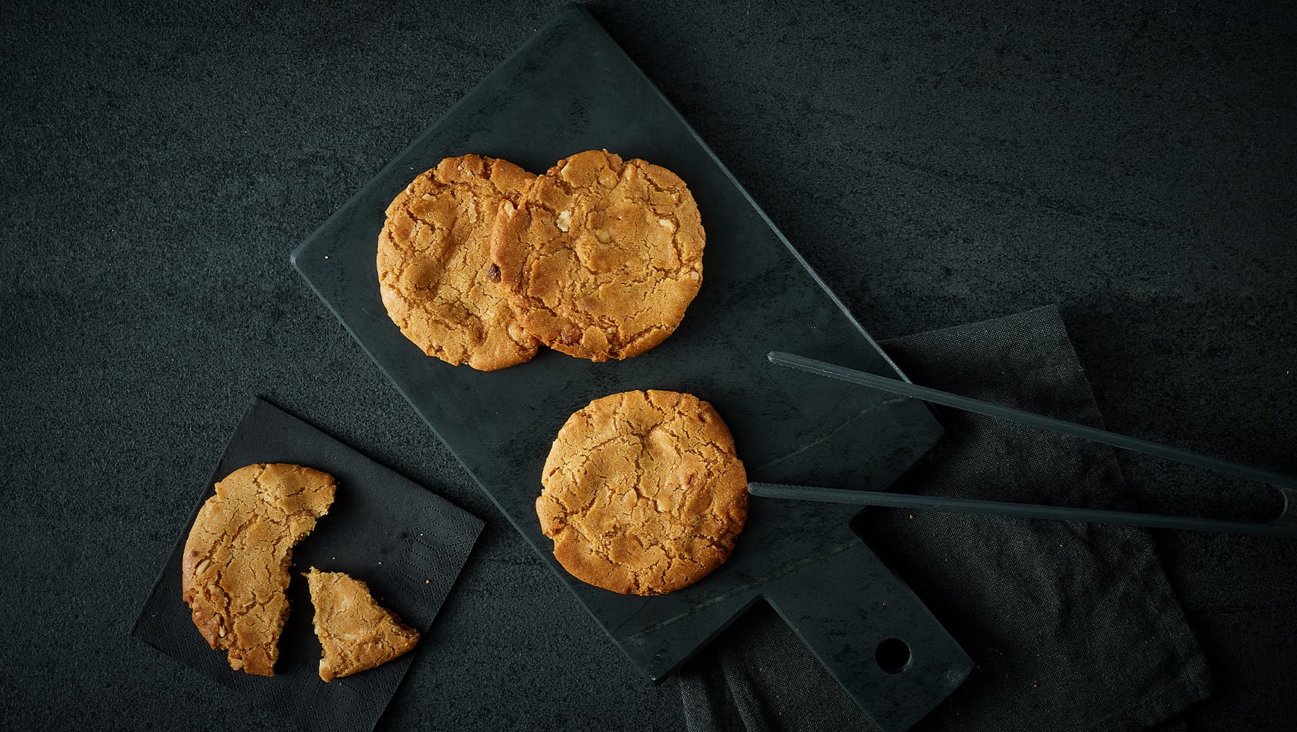 Galleta crujiente y densa con trocitos de chocolate blanco y avellanas.