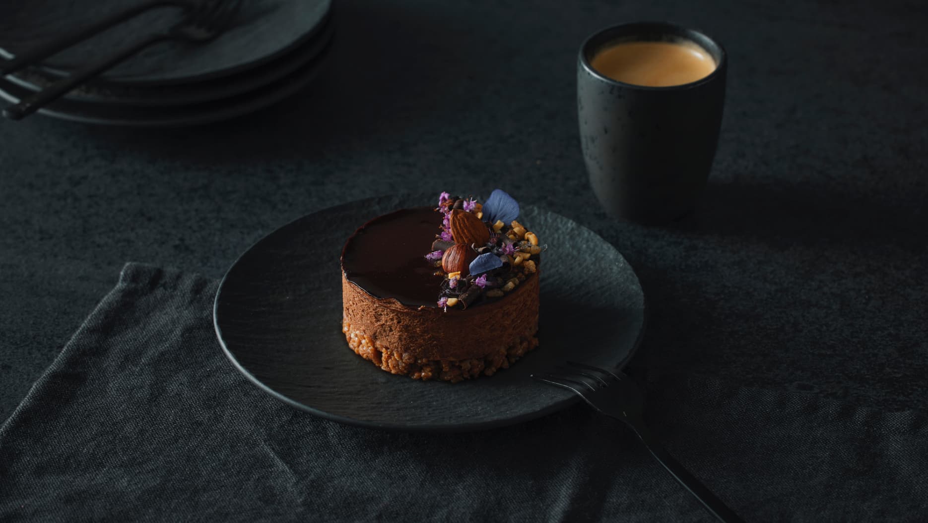 Mousse de chocolate belga. Elaborado con ingredientes de origen vegetal sobre un crumble de speculoos y glaseado con una brillante salsa de cacao.