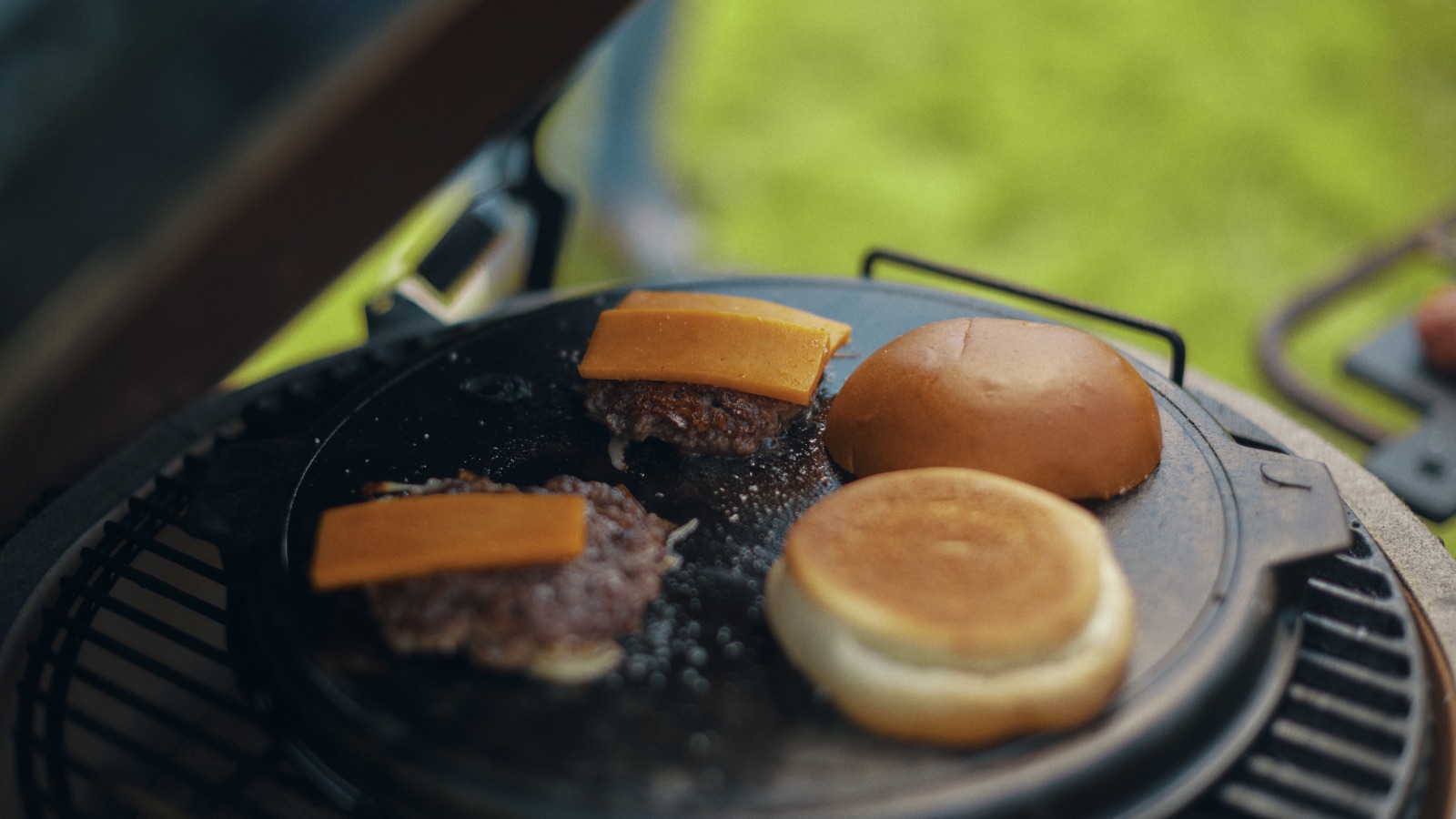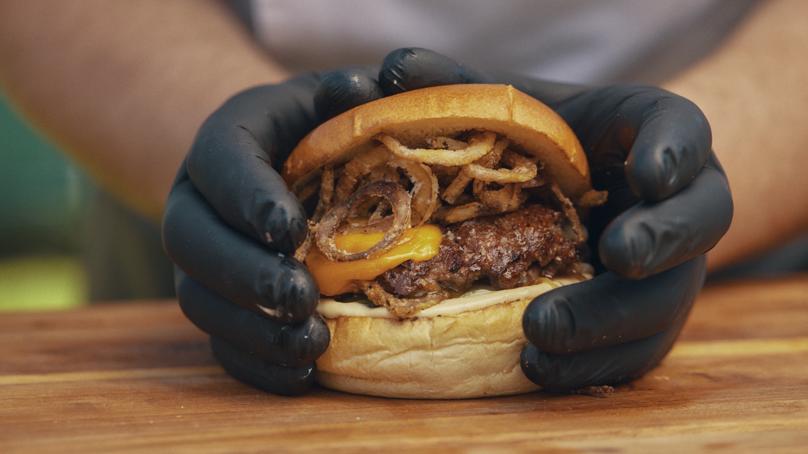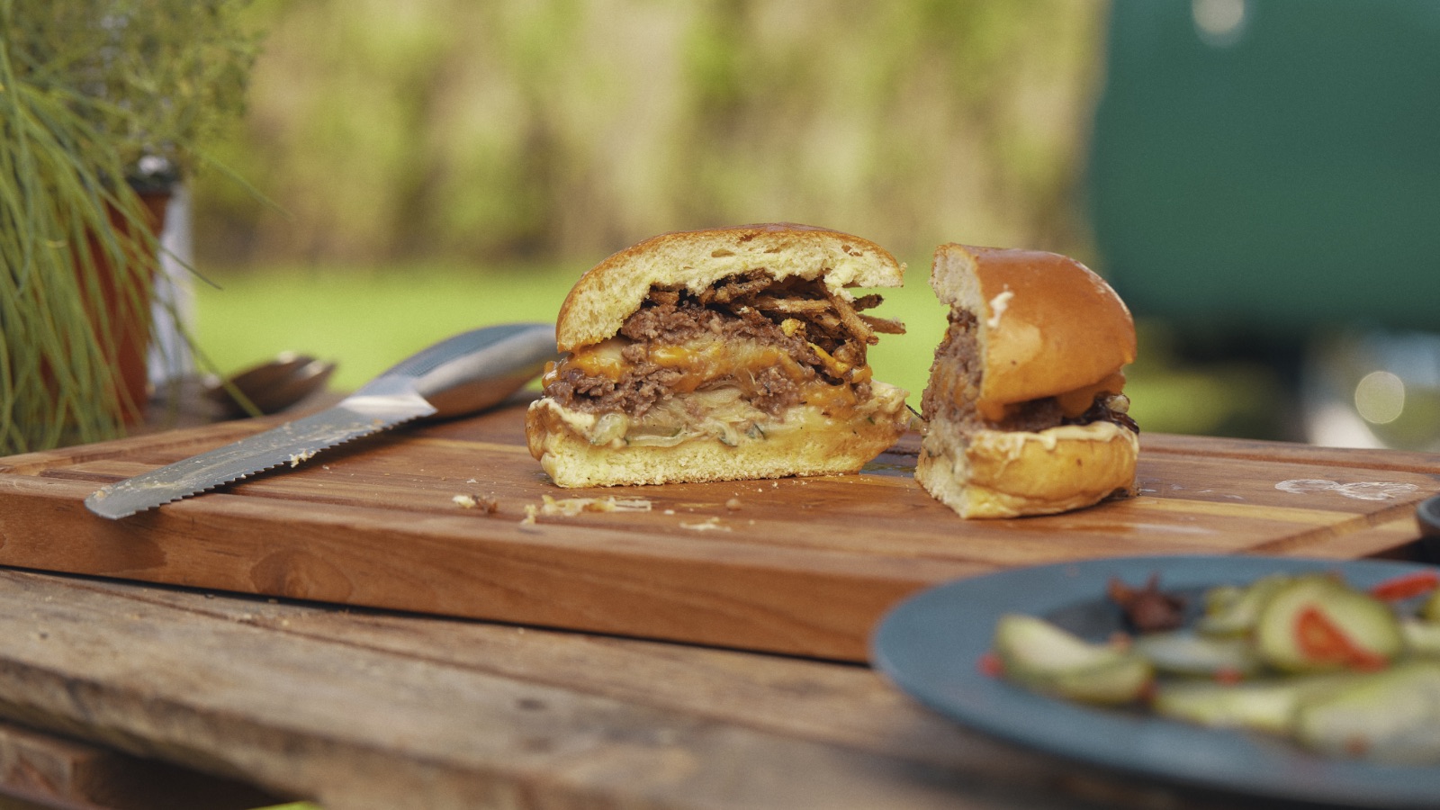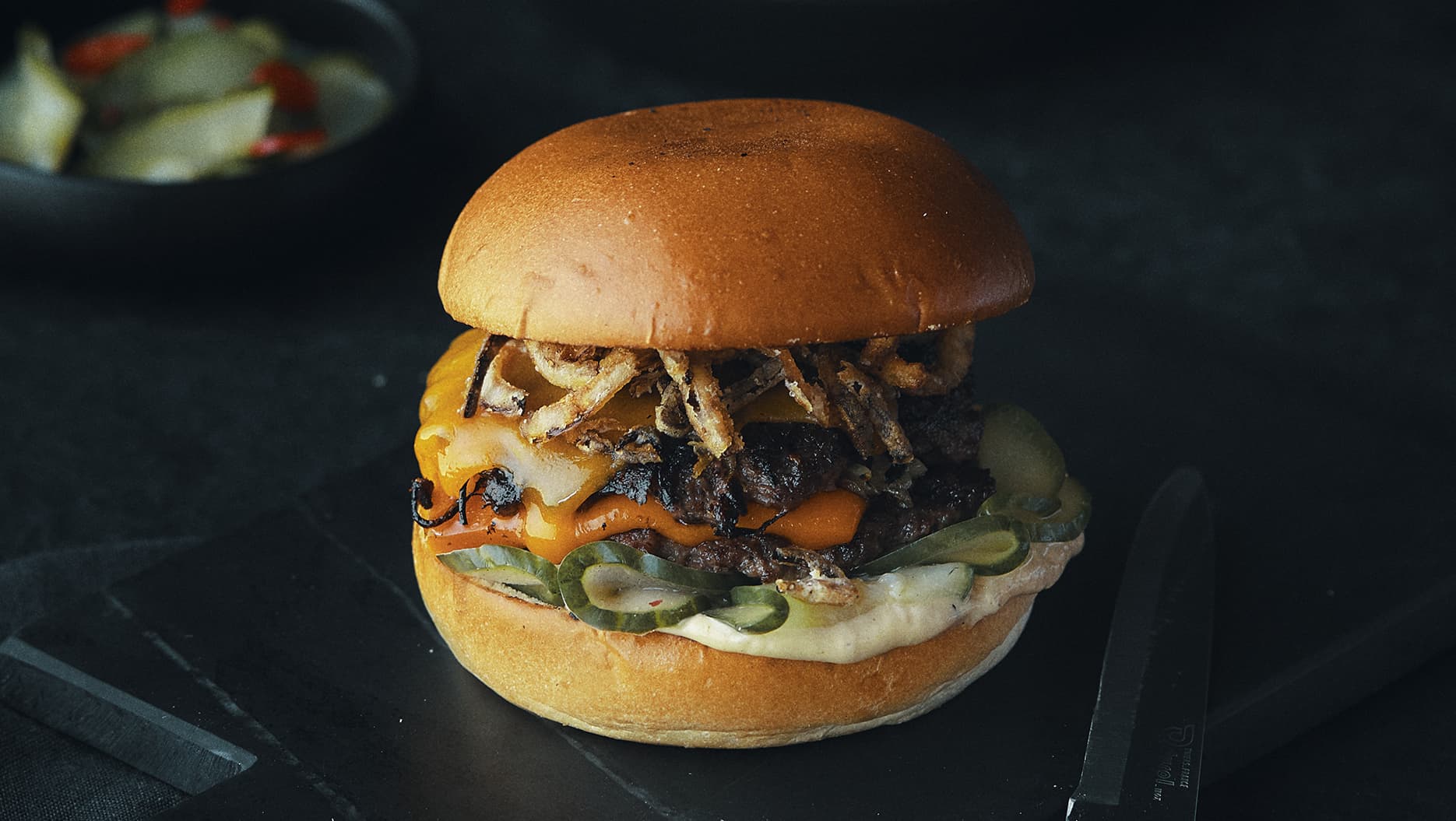 GOURMET BRIOCHE BUN PRE-SLICED 70, Hamburguesa de carne de ternera y cebolla frita a la plancha con queso cheddar y pepino encurtido.