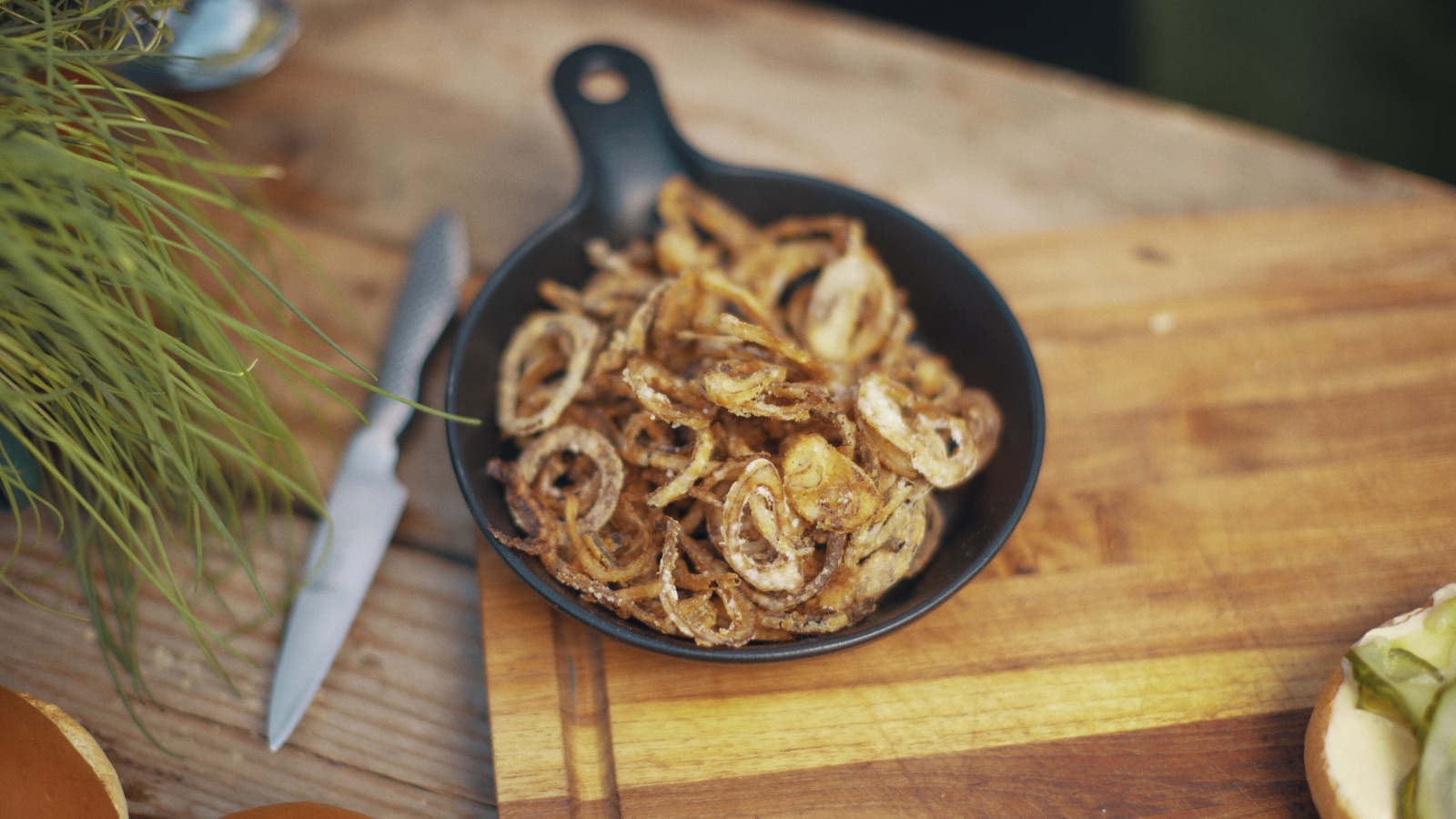 - Tuesta la parte cortada del panecillo y fríe la hamburguesa y los aros de cebolla en una sartén, sazona con pimienta y sal (ahumada).