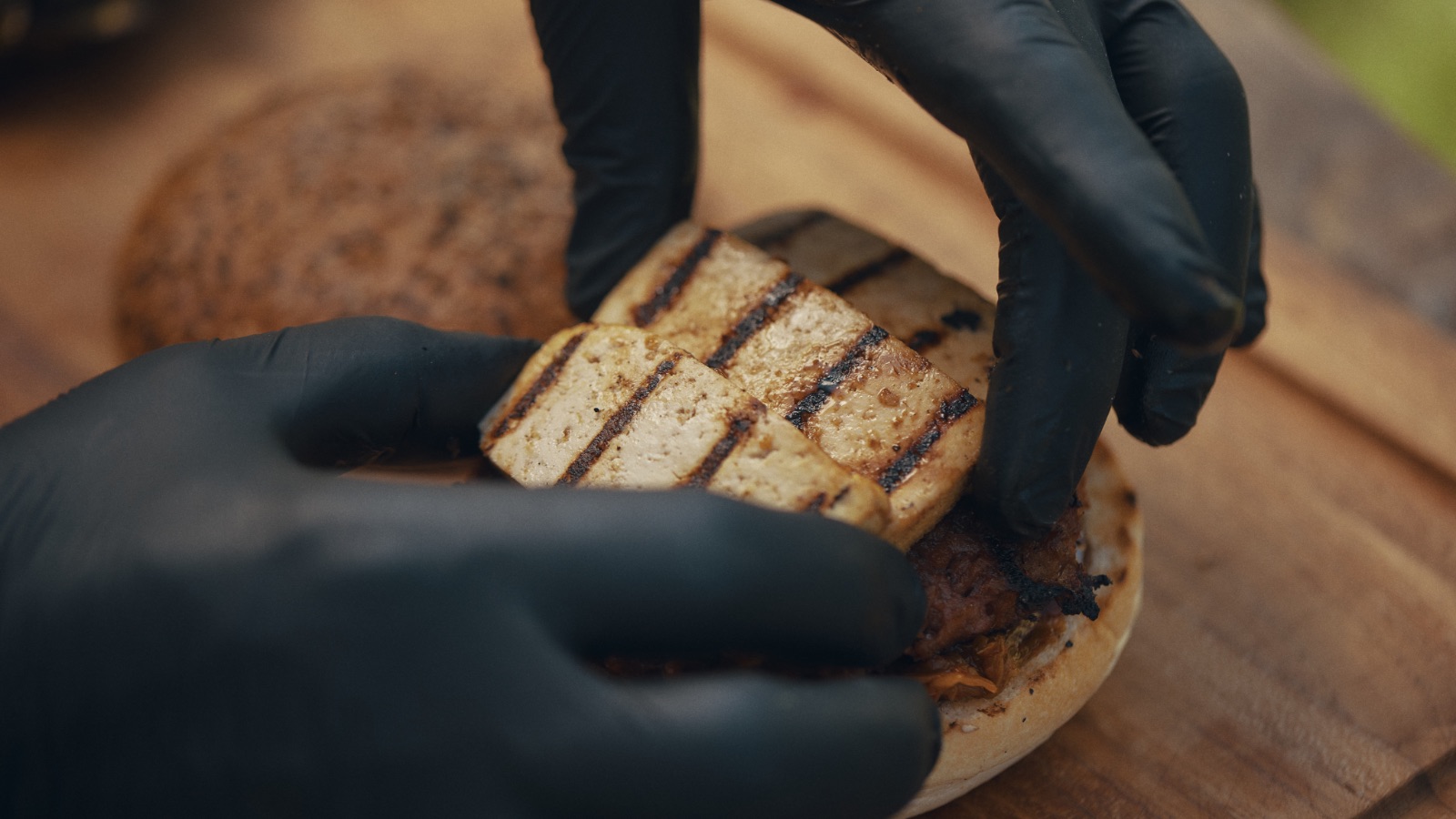 - Tuesta la parte cortada del panecillo y haz el tofu y la hamburguesa vegana a la parrilla, sazona con pimienta y sal (ahumada).