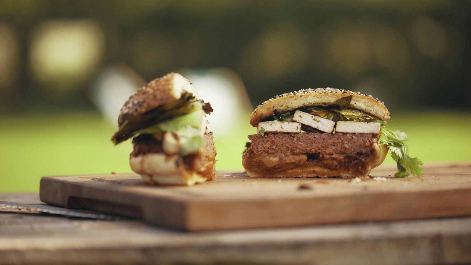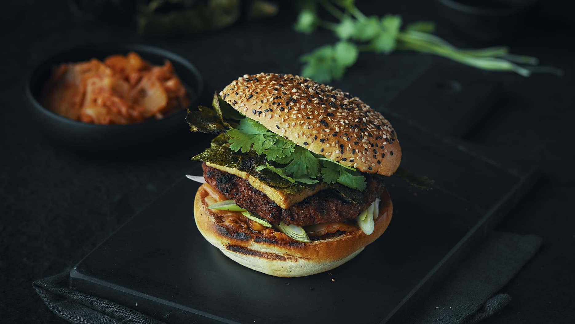 GOURMET BRIOCHE BUN SESAME MIX PRE-SLICED 70Hamburguesa vegana a la parrilla con salsa kimchi, alga nori y cilantro