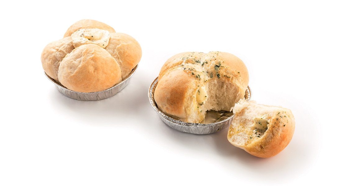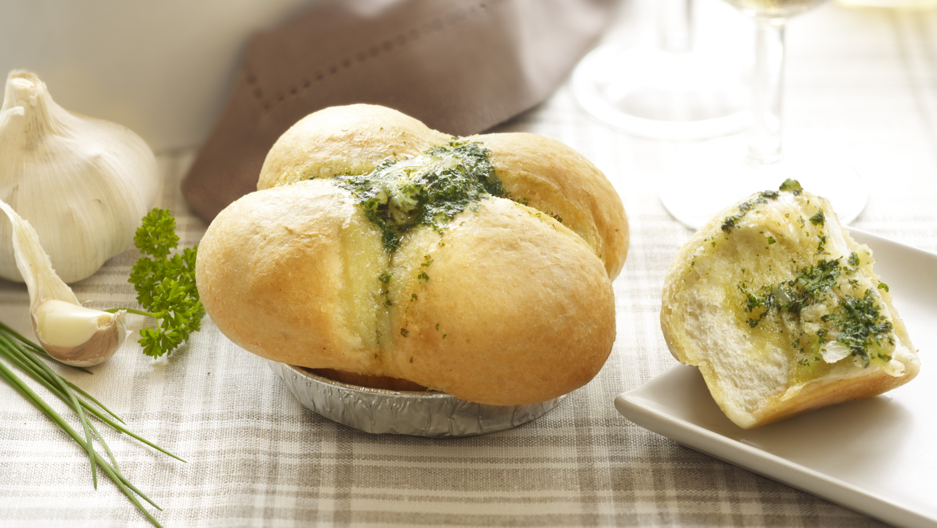 Négylevelű lóhere alakú, fokhagymás „tépd és oszd” kenyér, 4 db, tálcán egymáshoz sütött, a tetején és belül fokhagymás/provence-i fűszeres fűszervajjal megkent mini zsemléből.