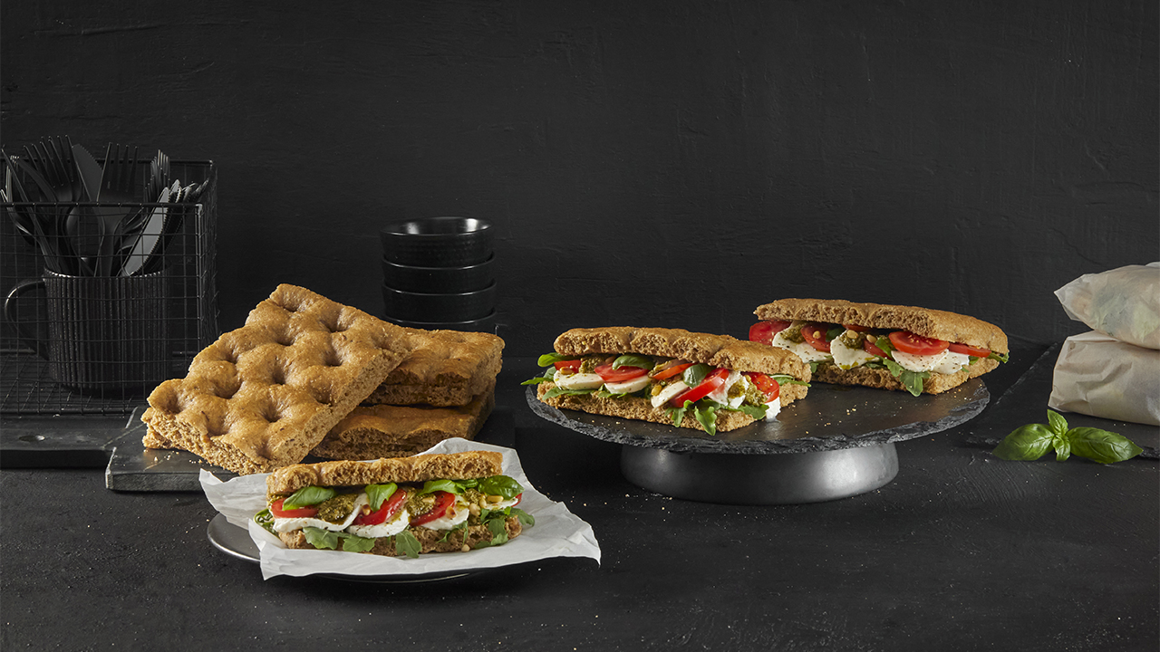 Előre szeletelt négyszög alakú focaccia laposkenyér finom olasz búzalisztből (0-ás típusú liszt), valamint teljes kiőrlésű tönköly-, rozs- és búzalisztek és pirított árpamaláta keverékéből. Kölessel, lenmaggal és napraforgómaggal dúsítva. Ideális szendvicsalap.