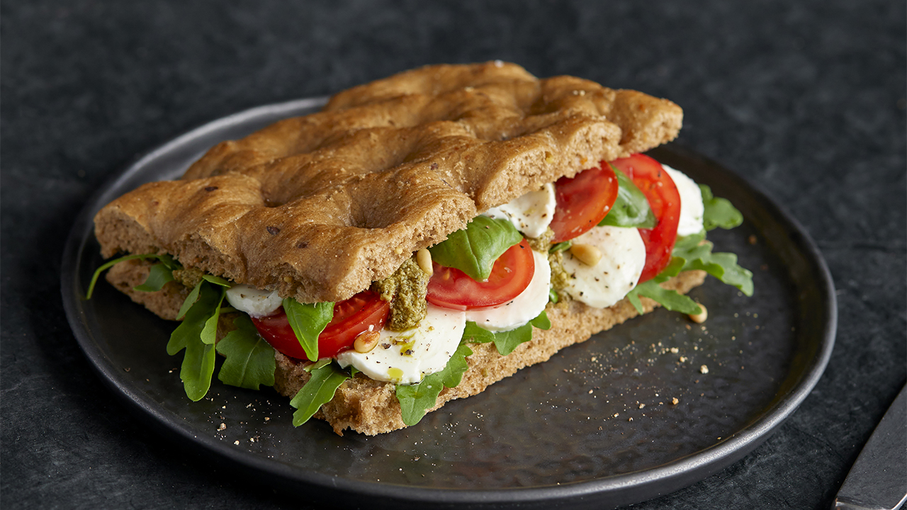 - Meleg szendvicsajánlat: előbb töltsük meg a focacciát, majd 1–2 percre tegyük a sütőbe (nagy sebességű kemence vagy kontaktgrill).