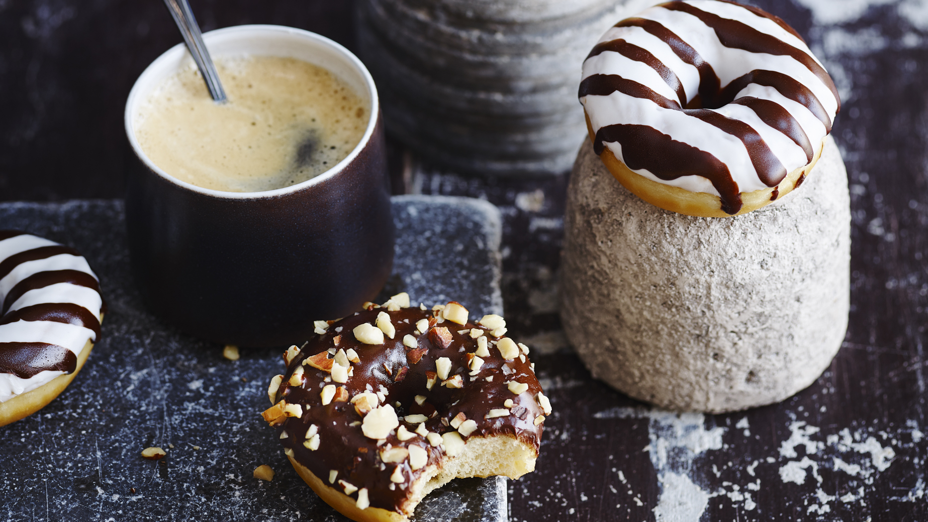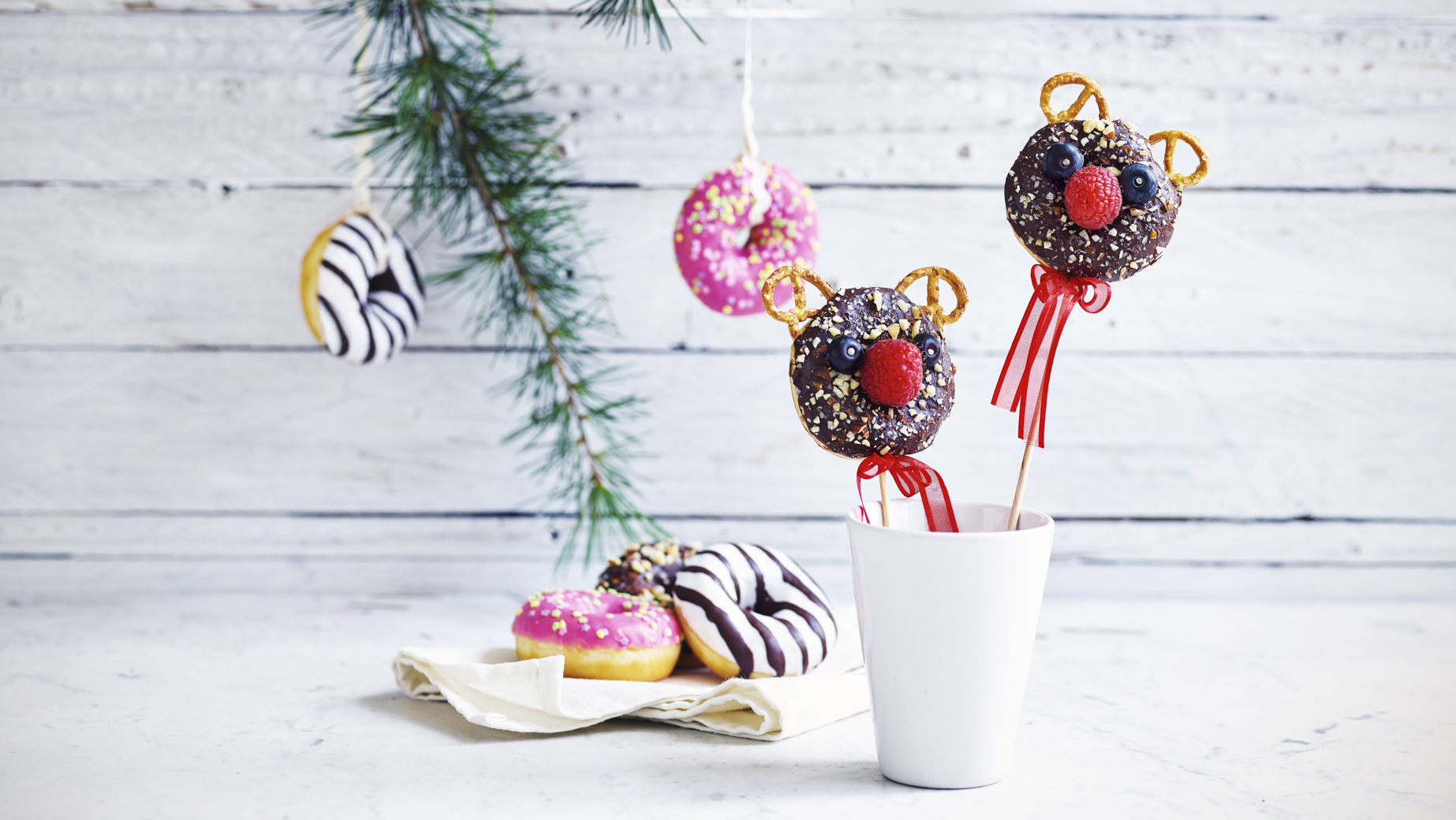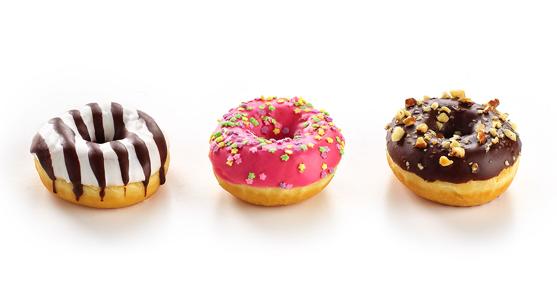 Kolekce obsahující výběr 3 druhů dekorovaných minidonutů bez náplně: 32 bílých s tmavými proužky, 32 růžových s barevnými květinovými konfetami a 32 tmavých s neloupanými mandlemi.