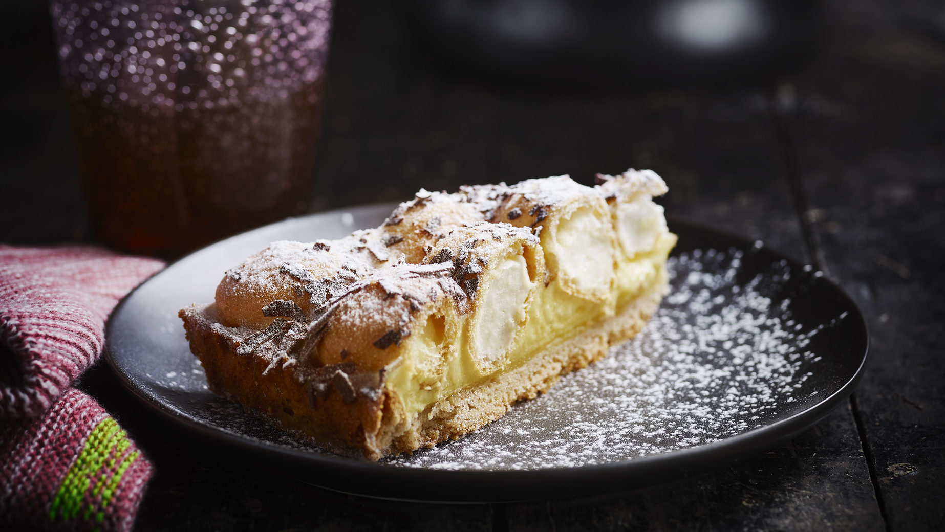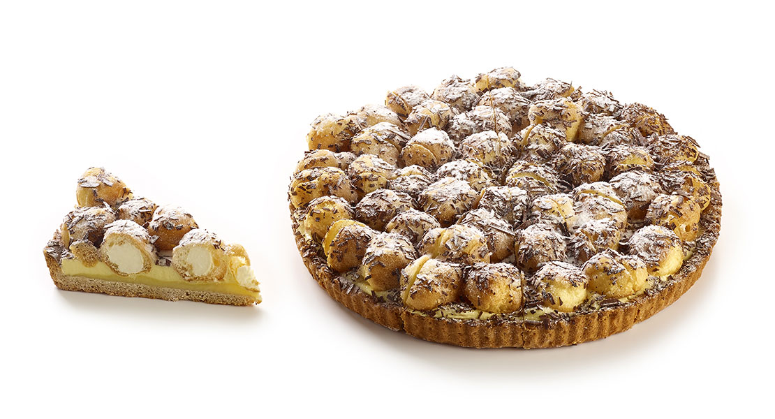 Profiterolkový dort s tenkou vrstvou vanilkového pudinkového krému, pokrytý cukrářským (lehkým pudinkovým) krémem a plněnými větrníčky, posypanými moučkovým cukrem a kousky čokolády hoblinami.Porcovaný (12 ks)