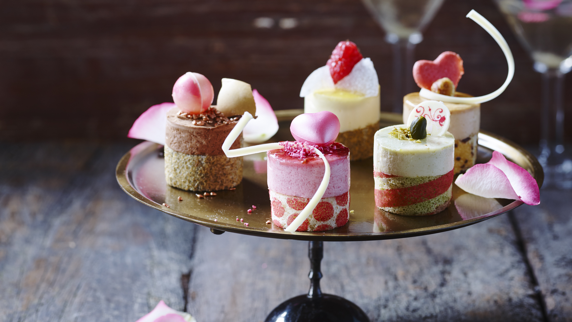 Výběr bavorských krémových dezertů ve 3 ovocných a 2 čokoládových variantách. Zdobené piškotem a lesklou ovocnou polevou. V 5 chuťových variantách: 4x pistácie-mléčná čokoláda, 4x maracuja, 4x maliny, 4x périgourdine, 4x schwarzwaldský bavorský krém.
