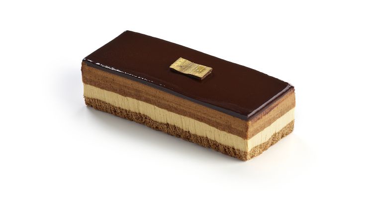 Hranatý dezert s bavorským krémem z čokolády a kávy. Proložený vrstvou křupavého mandlového korpusu a zdobený polevou z hořké čokolády.