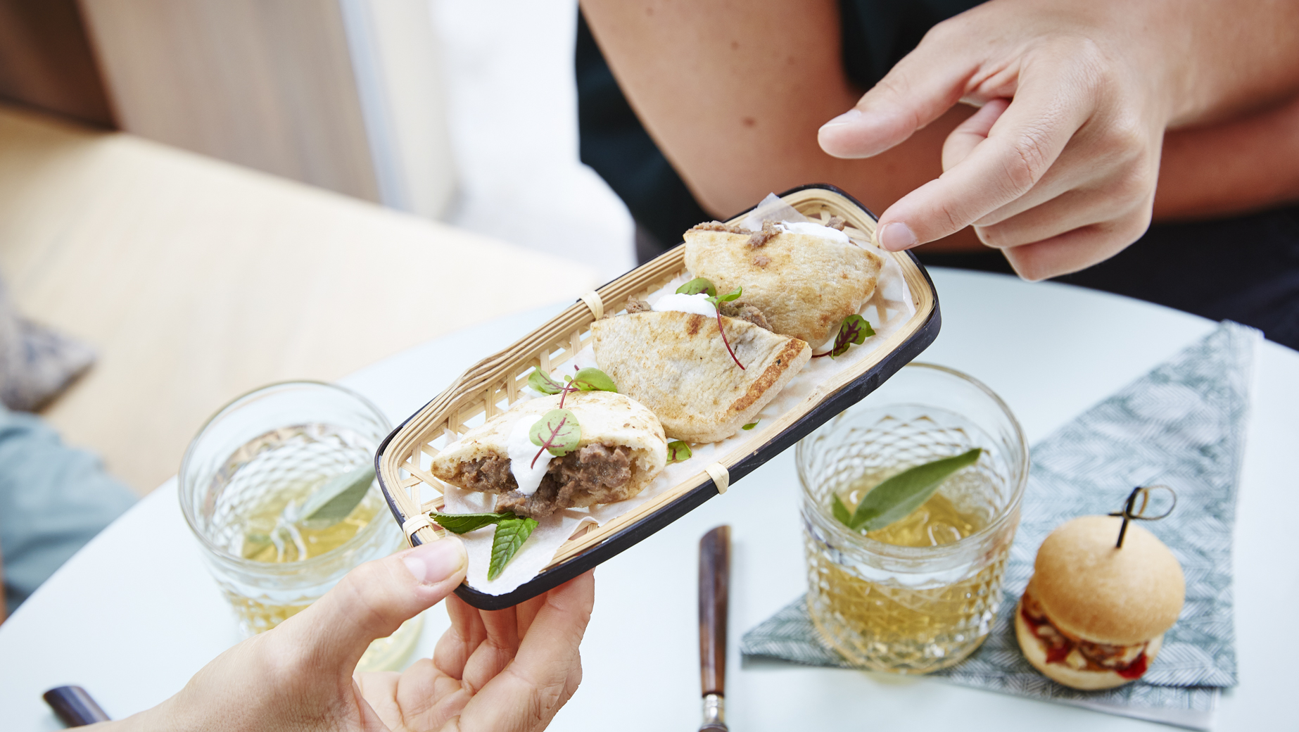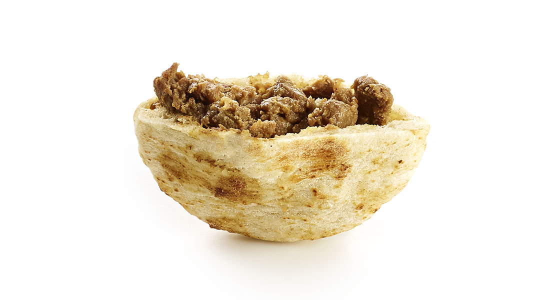 Originální minipita plněná křehkými pečenými hovězími proužky marinovanými ve směsi kari z Madrásu.