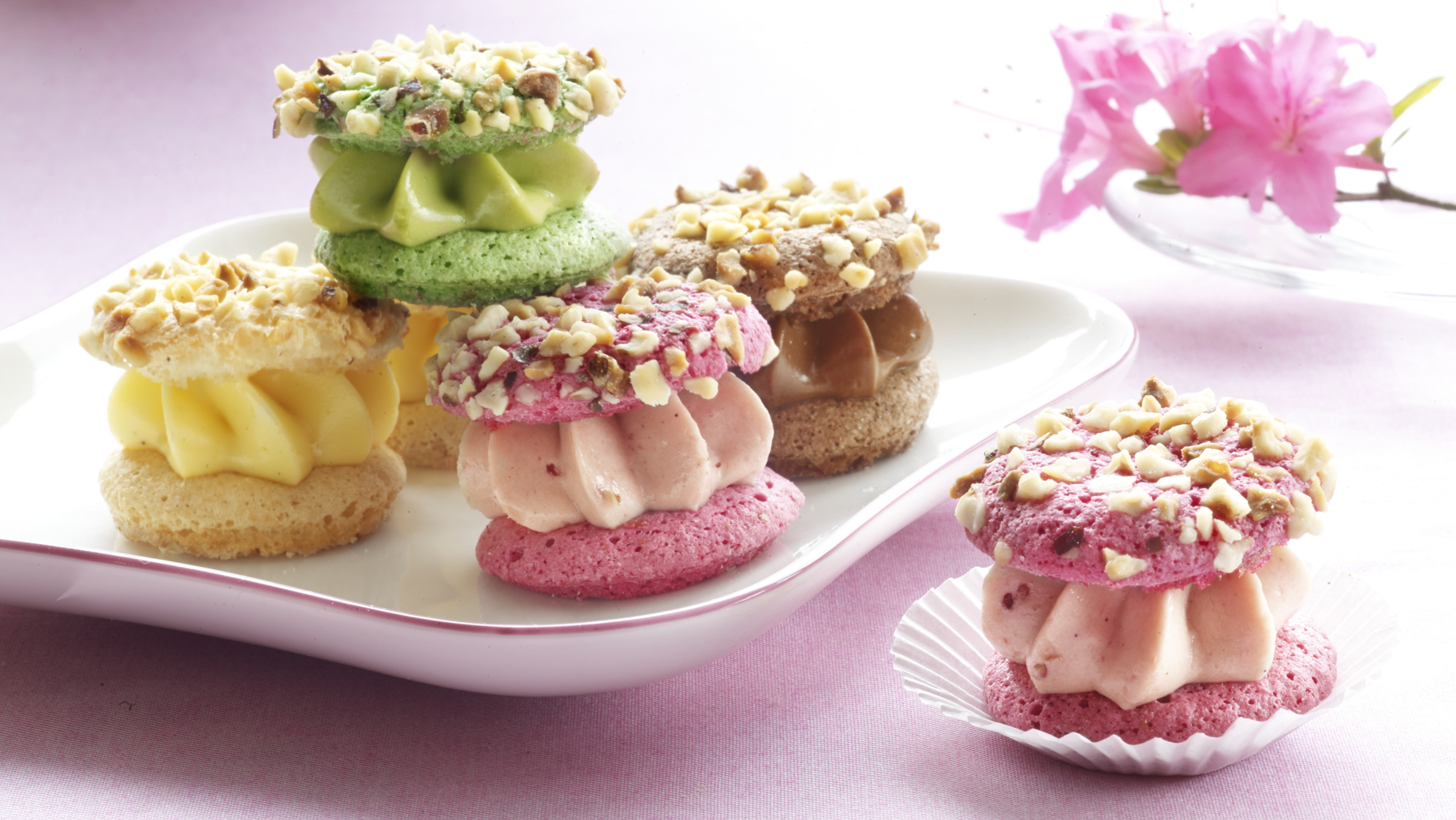 Balení jemných makronek (pusinka s mandlemi) plněných máslovým krémem a zdobených lískovými ořechy. Obsahuje 4 pistáciové, 4 malinové, 4 čokoládové a 4 vanilkové makronky; belgická specialita.