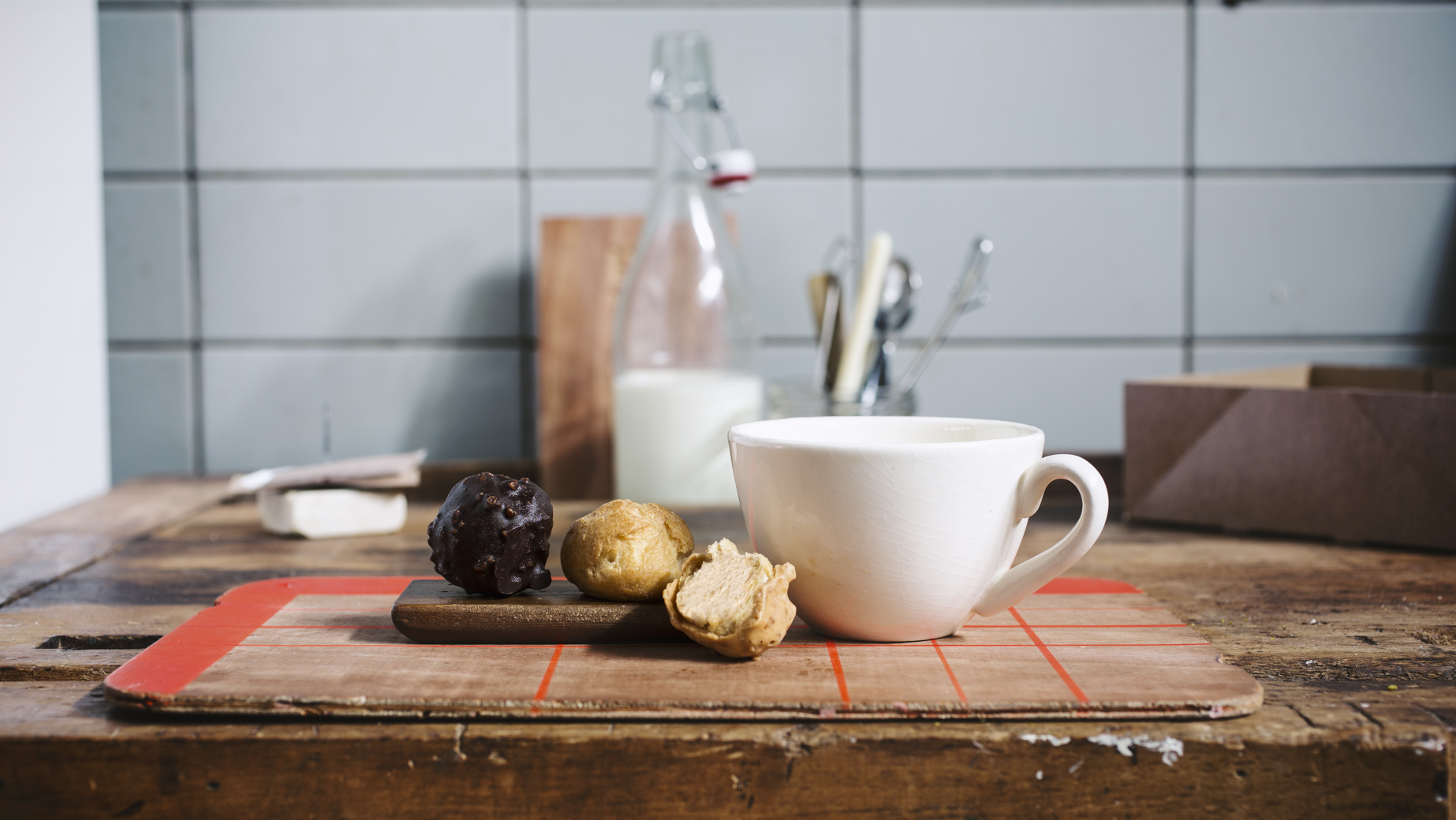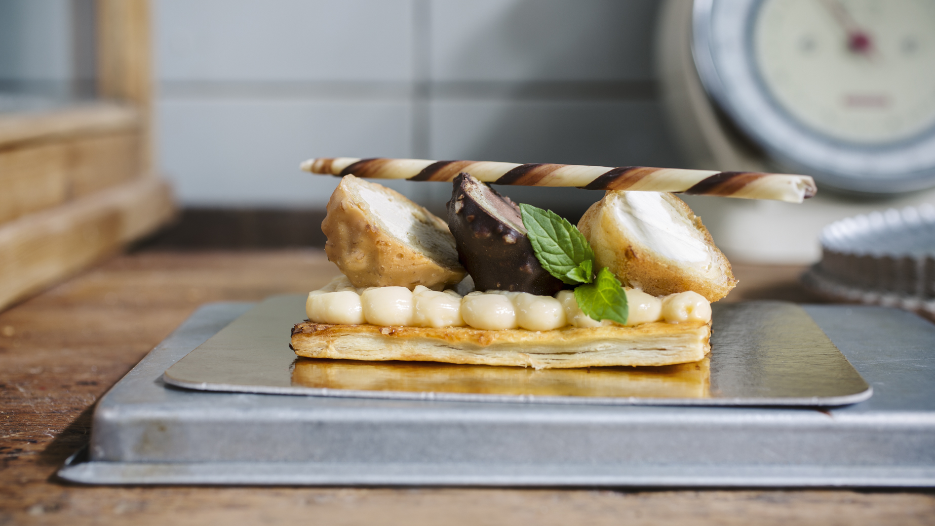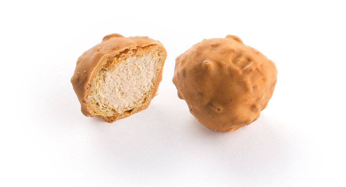 Profiterolka z odpalovaného těsta plněná karamelovou pěnou a ozdobená jemně křupavou karamelovou polevou.
