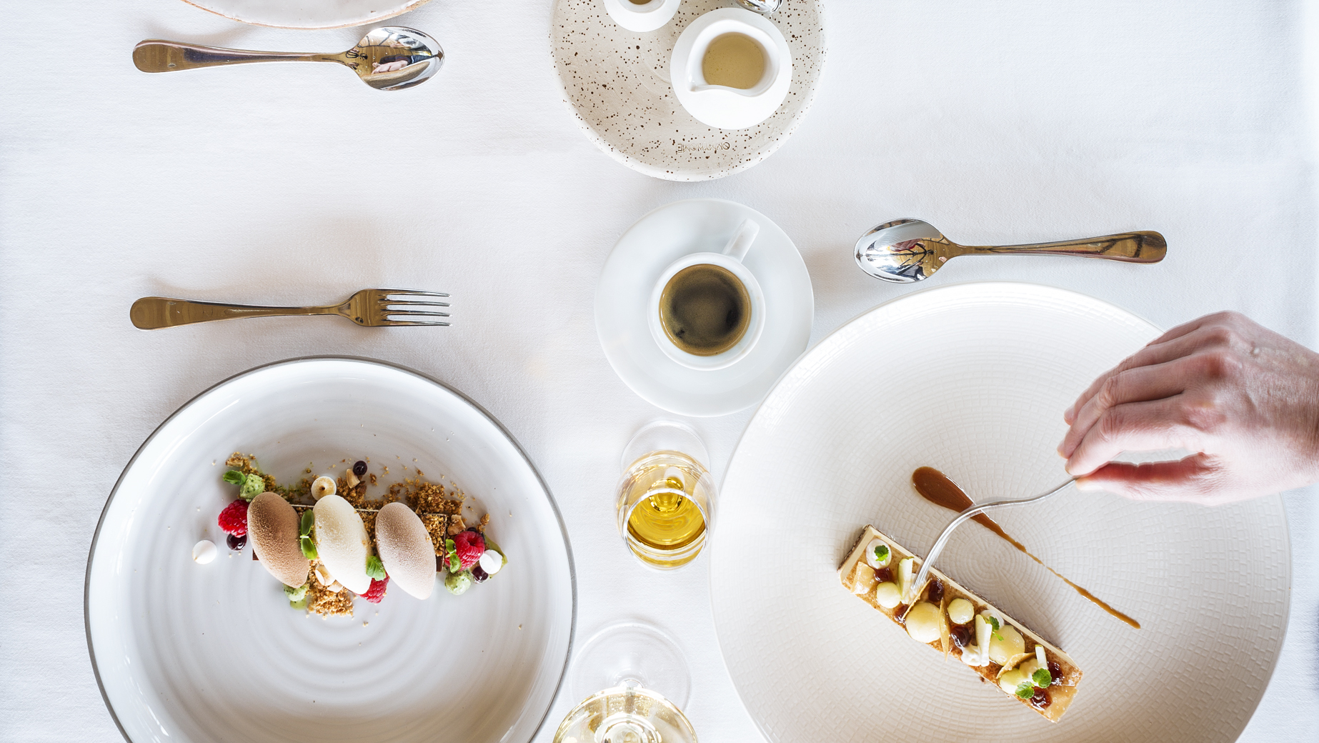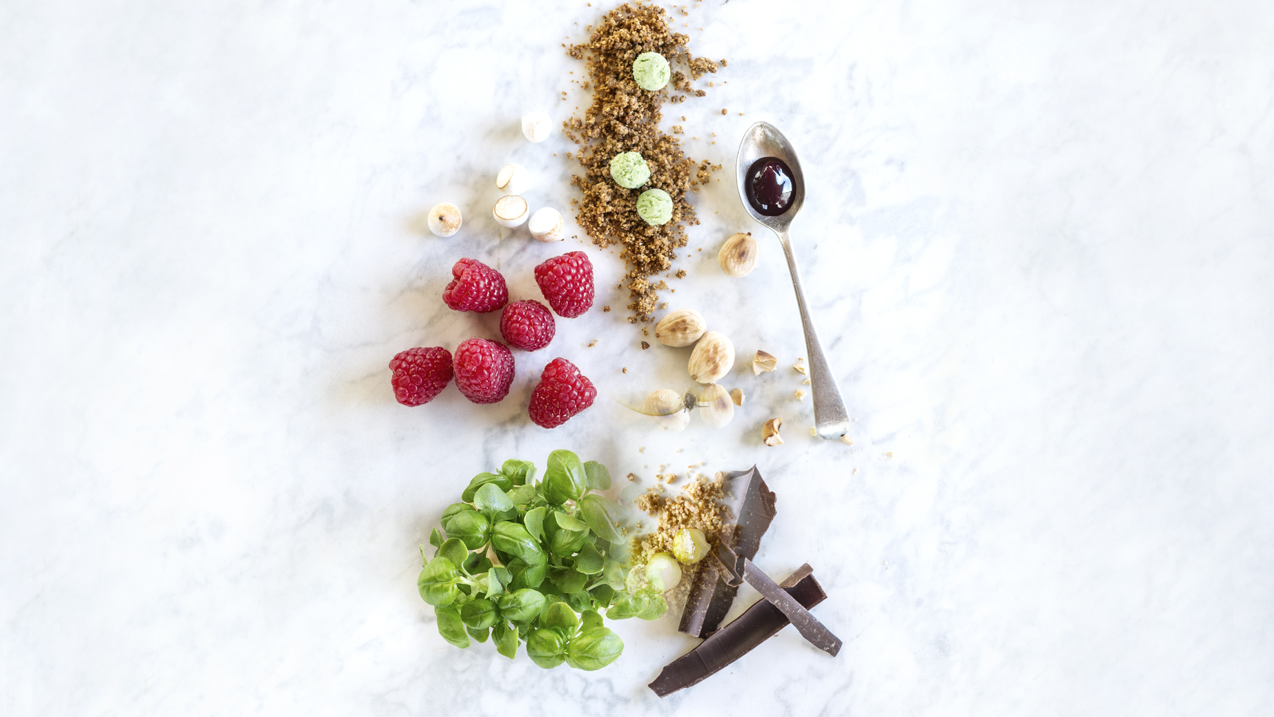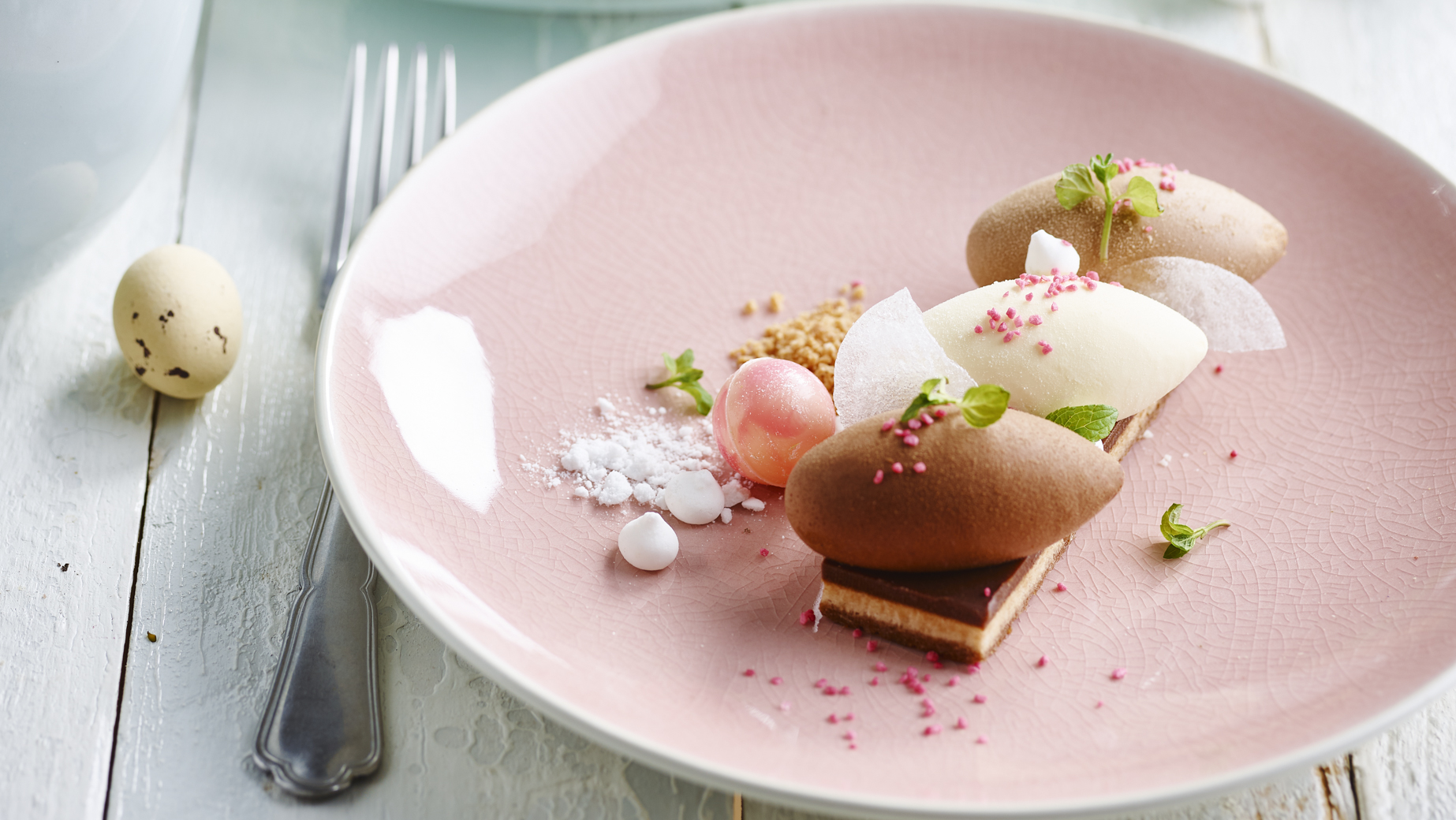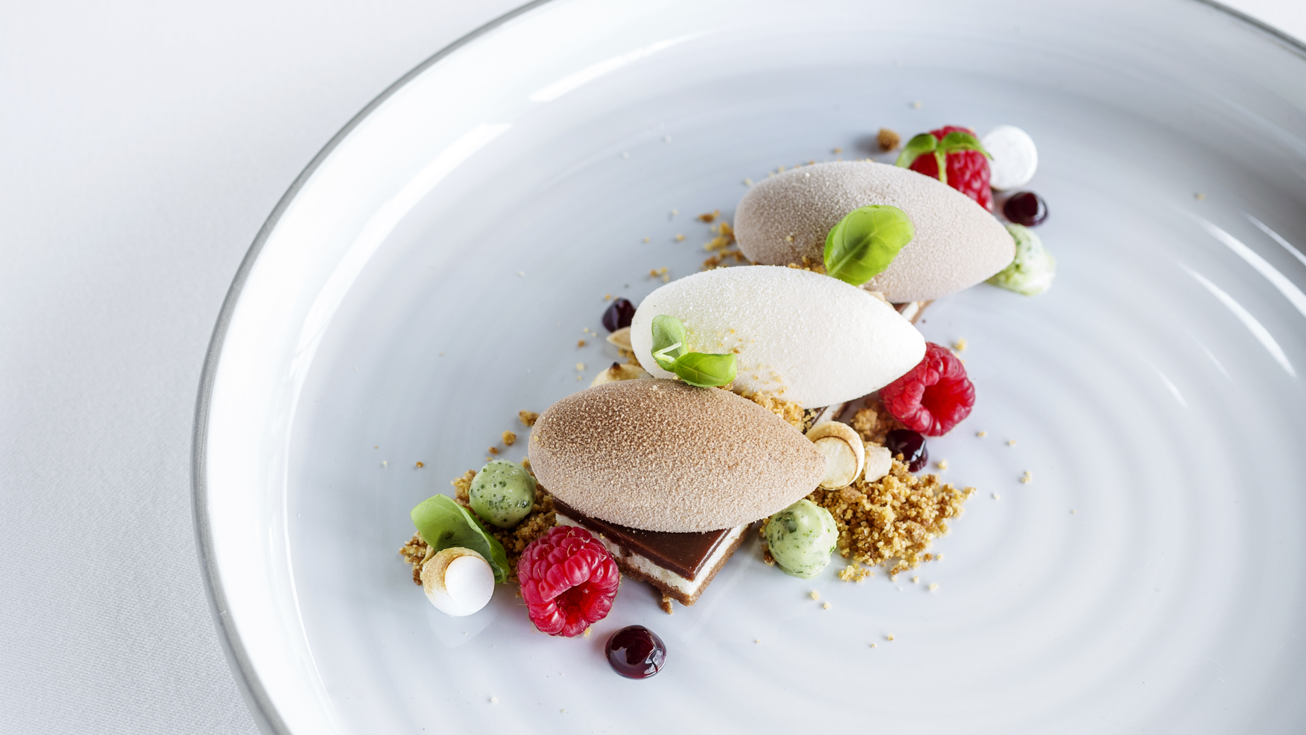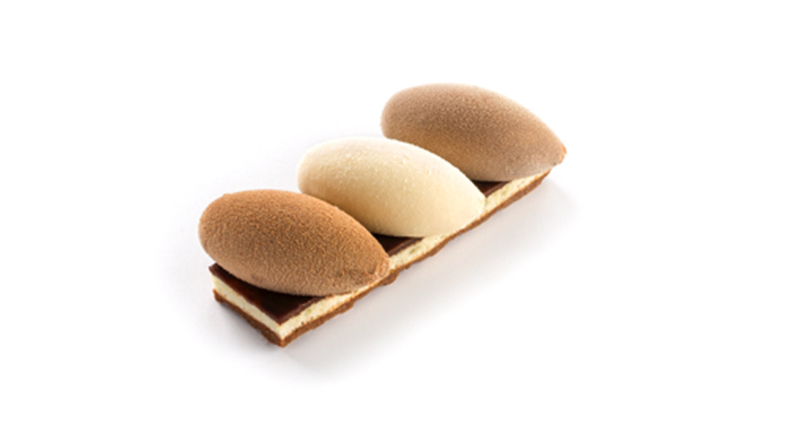 Tři pěnové nočky z bavorského krému s bílou, mléčnou a hořkou belgickou čokoládou na křupavém francouzském biskvitu feulletine, mandlovém piškotu a krému ganache. Lehce posypané čokoládou.