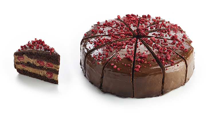 Předkrájený (na 12 porcí) vysoký dort se 3 vrstvami čokoládového piškotového těsta proloženými vrstvami čokoládového krému s celými malinami. S lesklou čokoládovou polevou, posypaný malinovými granulemi sušené mrazem.