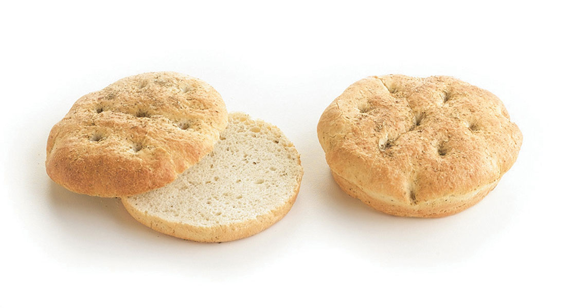 Vorgeschnittenes rundes Focaccia-Brötchen, angereichert mit extra nativem Olivenöl und feinen Kräutern, wie Oregano und Rosmarin.