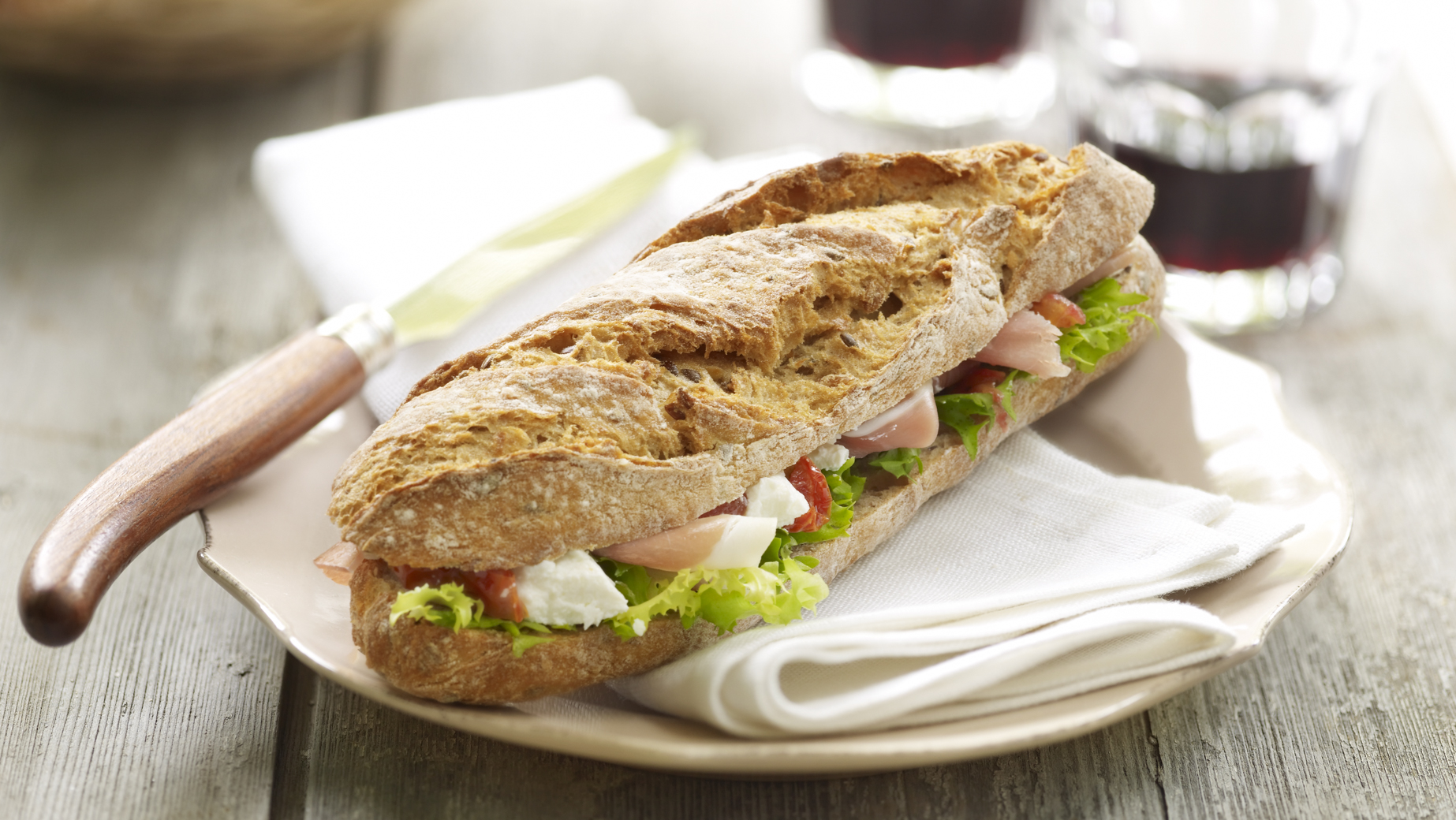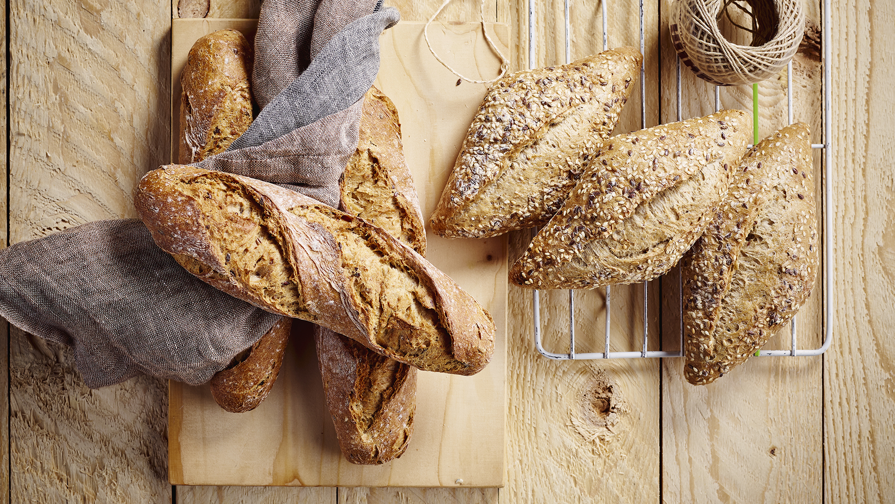 Handwerkliches Brötchen (Größe Halb-Baguette) aus Weizen- und Roggenmehl mit Weizensauerteig, veredelt mit Hafergrütze, Leinsamen, Sonnenblumenkernen, Sesam, Weizenkleie und etwas Malz zur Verbesserung des Geschmacks, im Steinofen gebacken und mit 2 Einschnitten auf der Oberseite.