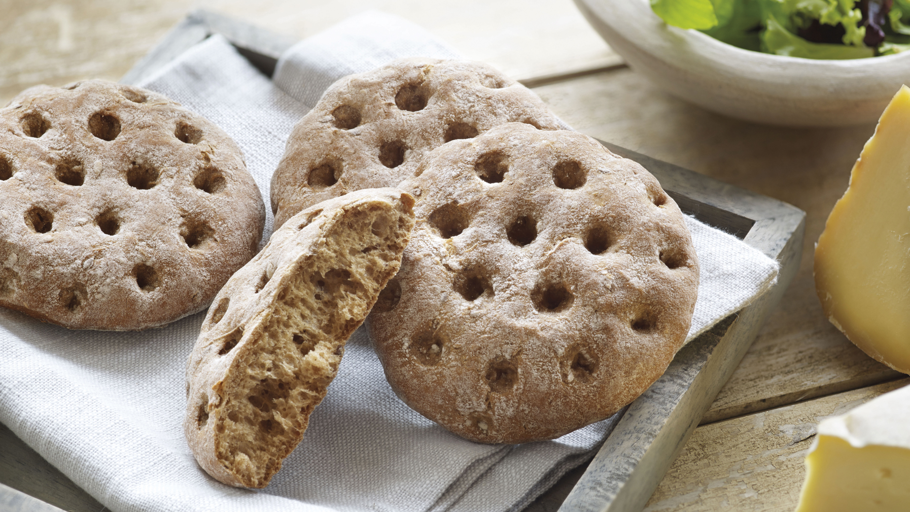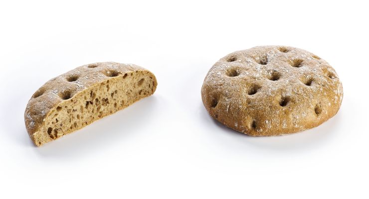 Rustikales, auf Stein gebackenes, flaches Weizenbrot mit Roggenmehl und angereichert mit Haferschrot, Sesam und Leinsamen. Offene und saftige Krumenstruktur.