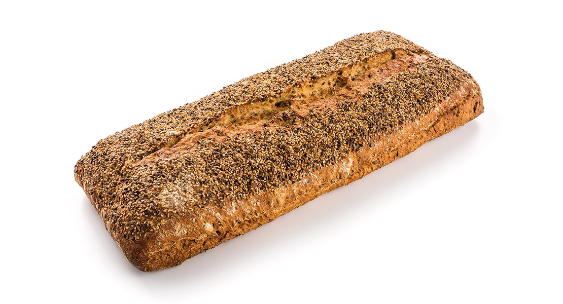 Handwerklicher brauner Mehrkorn-Sauerteiglaib aus Weizen und Weizenvollkorn, mit einem flüssigen natürlichen Sauerteig aus Weizen und Roggenmehl, angereichert mit geröstetem Sesam, Kürbiskernen & Leinsamen. Garniert mit Leinsamen und Sesam, auf Stein gebacken.