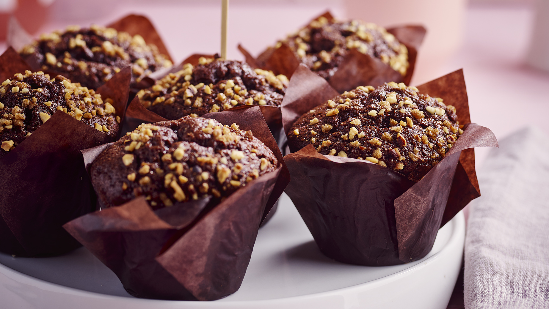 Muffin aus dunkler Schokolade mit einer Füllung aus gesalzenem Butterkaramell, garniert mit karamellisierten Haselnüssen.