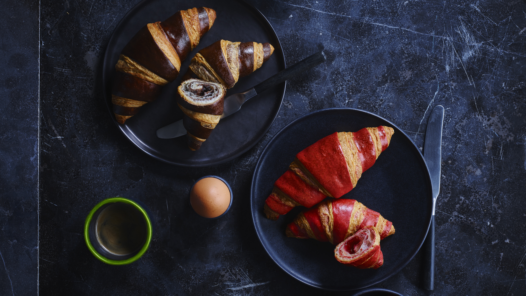 Neben der zweifarbigen Schichttechnik unterscheidet sich dieses Croissant durch den Einsatz von Butter und eine Sauerteignote, die den kräftigen Geschmack verstärkt.