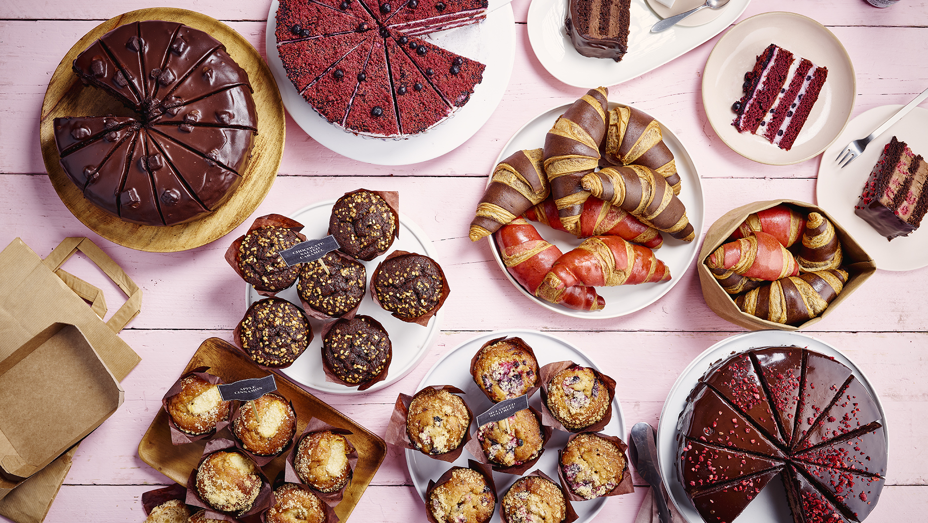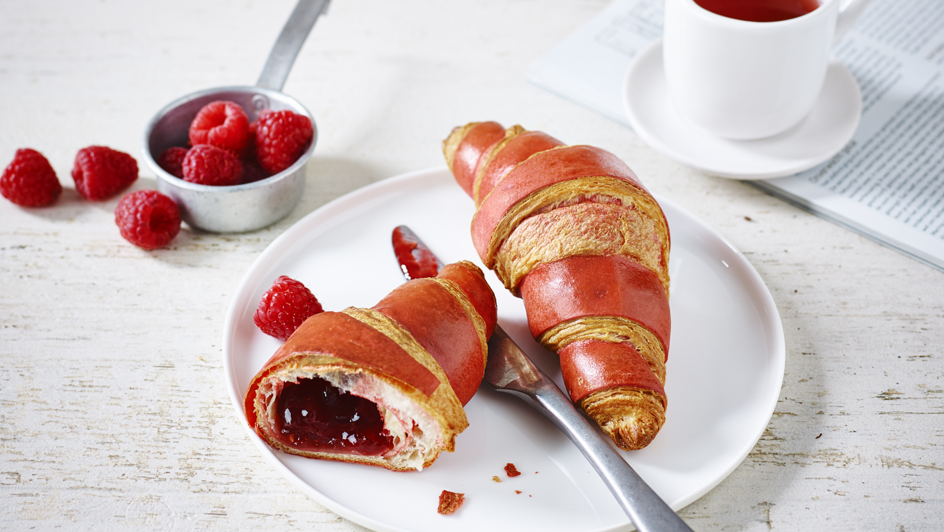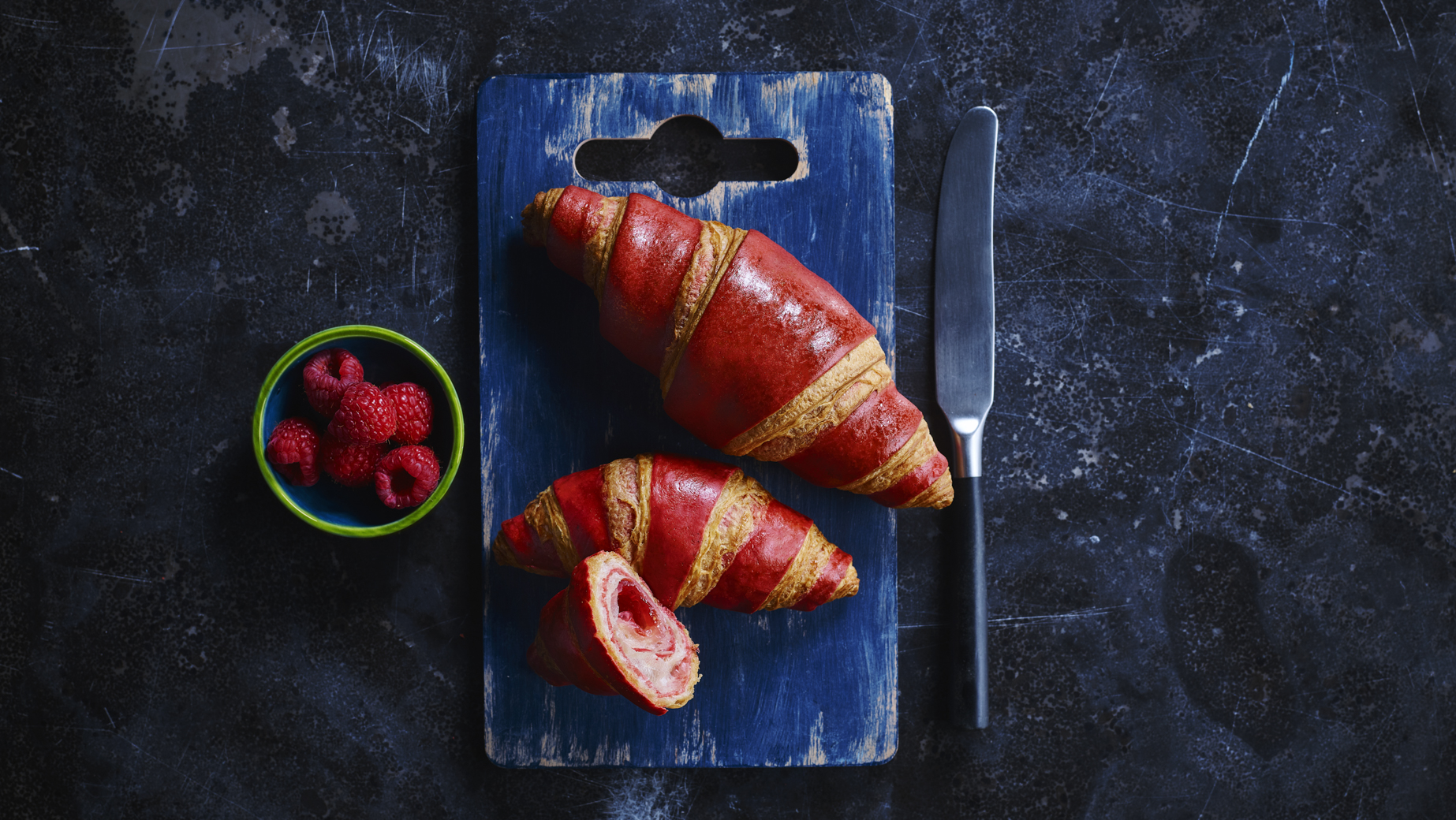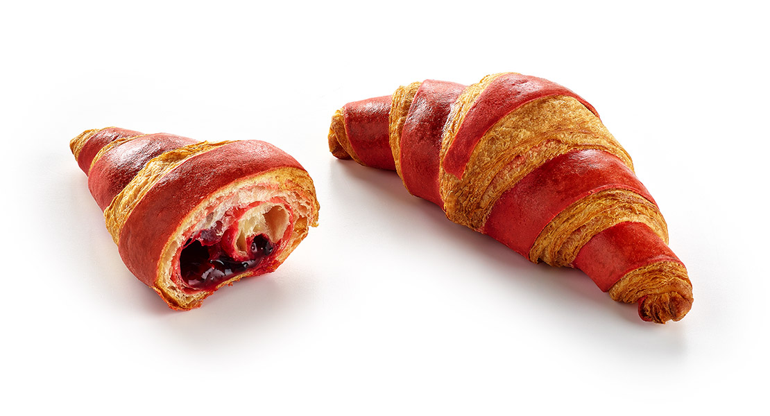Voluminöses, schön geschichtetes doppelt gefärbtes Buttercroissant, geschaffen durch die Umarmung von zwei Aromen eines mehrlagigen Hefeteigs (Natural und Himbeere), durchzogen mit einer reichen Himbeerfüllung. Hergestellt mit 16% Butter (Anteil am Gesamtrezept).